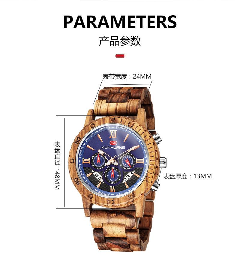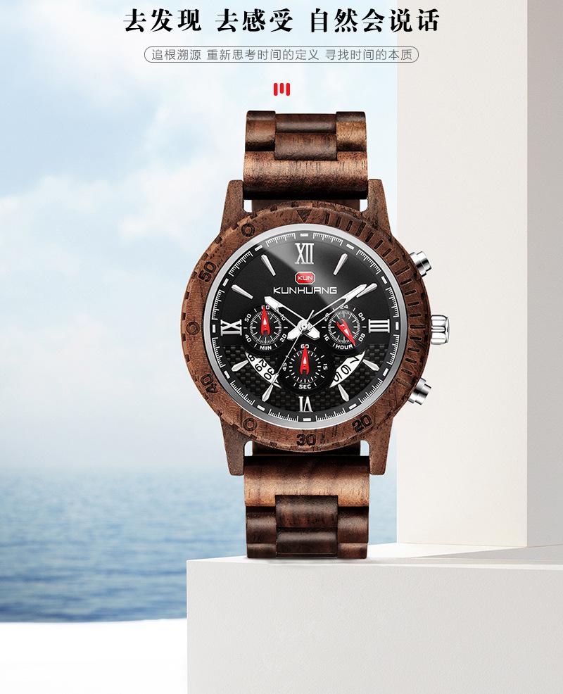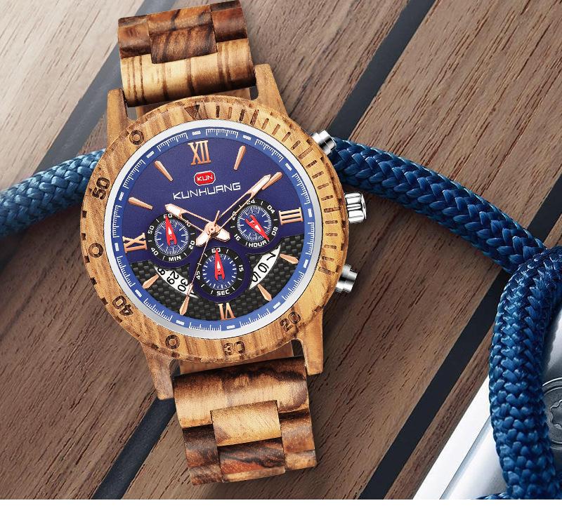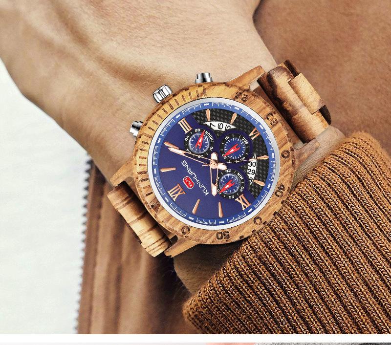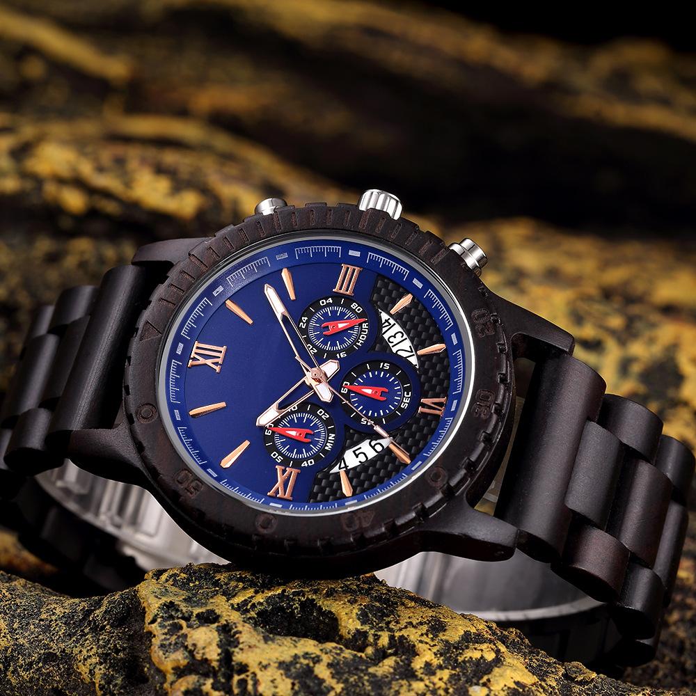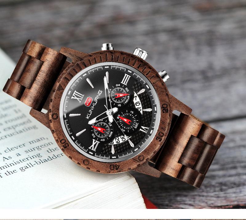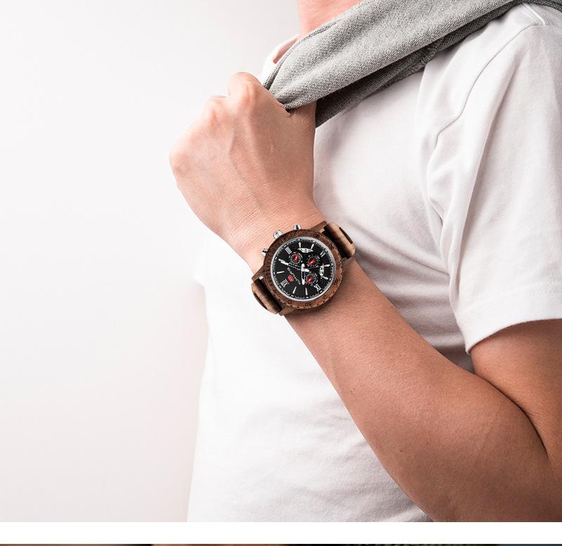 Relógio de Madeira, Relógio Masculino da Moda, Relógio de Quartzo Multifuncional de Seis Ponteiros e Três Olhos, Relógio de Madeira Popular com Calendário Masculino, Estilo de Vida à Prova d'Água por Atacado