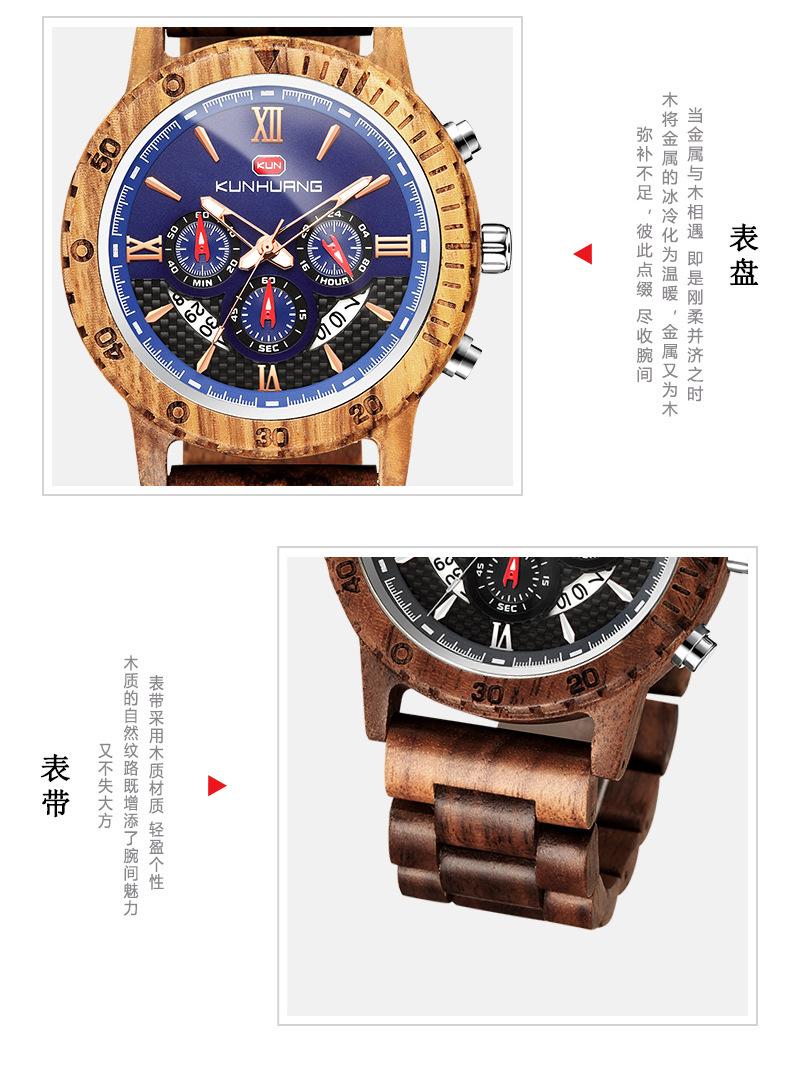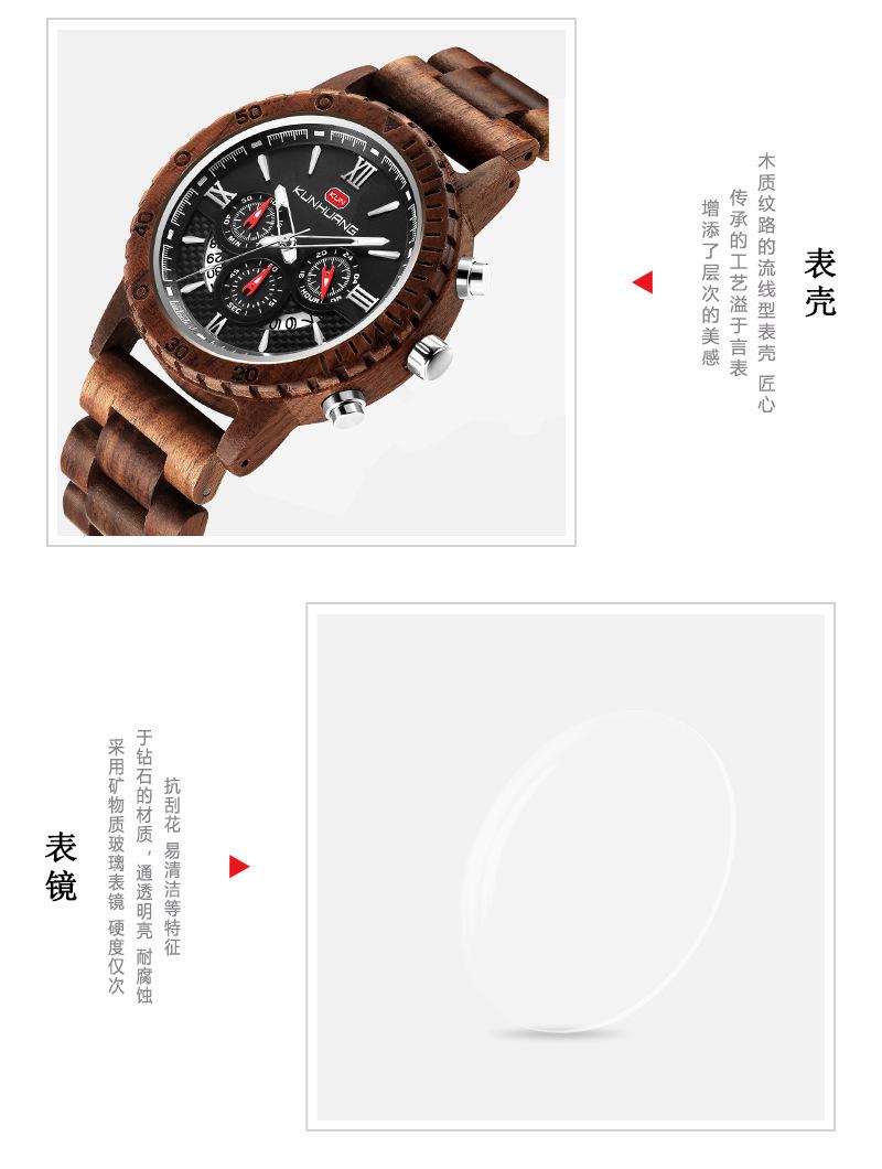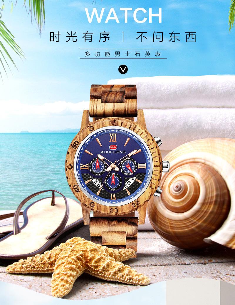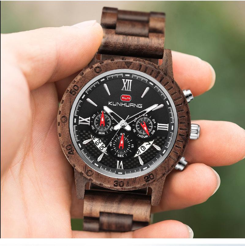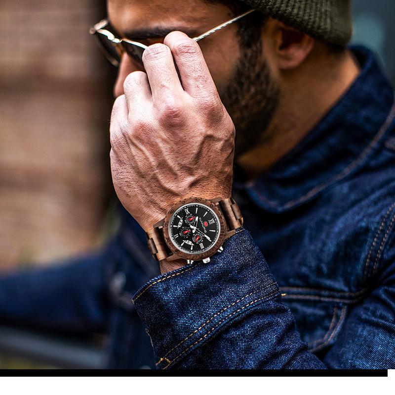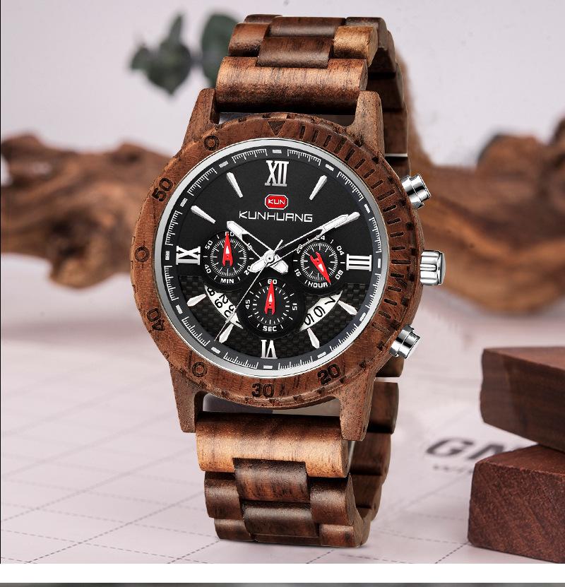 Relógio de Madeira, Relógio Masculino da Moda, Relógio de Quartzo Multifuncional de Seis Ponteiros e Três Olhos, Relógio de Madeira Popular com Calendário Masculino, Estilo de Vida à Prova d'Água por Atacado