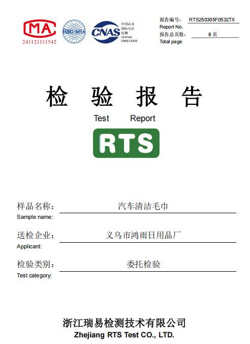 Esta toalha passou por rigorosos testes realizados por uma organização profissional e possui um relatório de teste formal. O relatório abrange diversos itens de teste, como aparência, tamanho, propriedades físicas (como absorção de água, respirabilidade, maciez), composição química (para garantir a ausência de metais pesados, corantes nocivos, etc.), solidez da cor, propriedades antibacterianas, etc. Todos os indicadores atendem ou até excedem os padrões da indústria, e a qualidade é confiável.