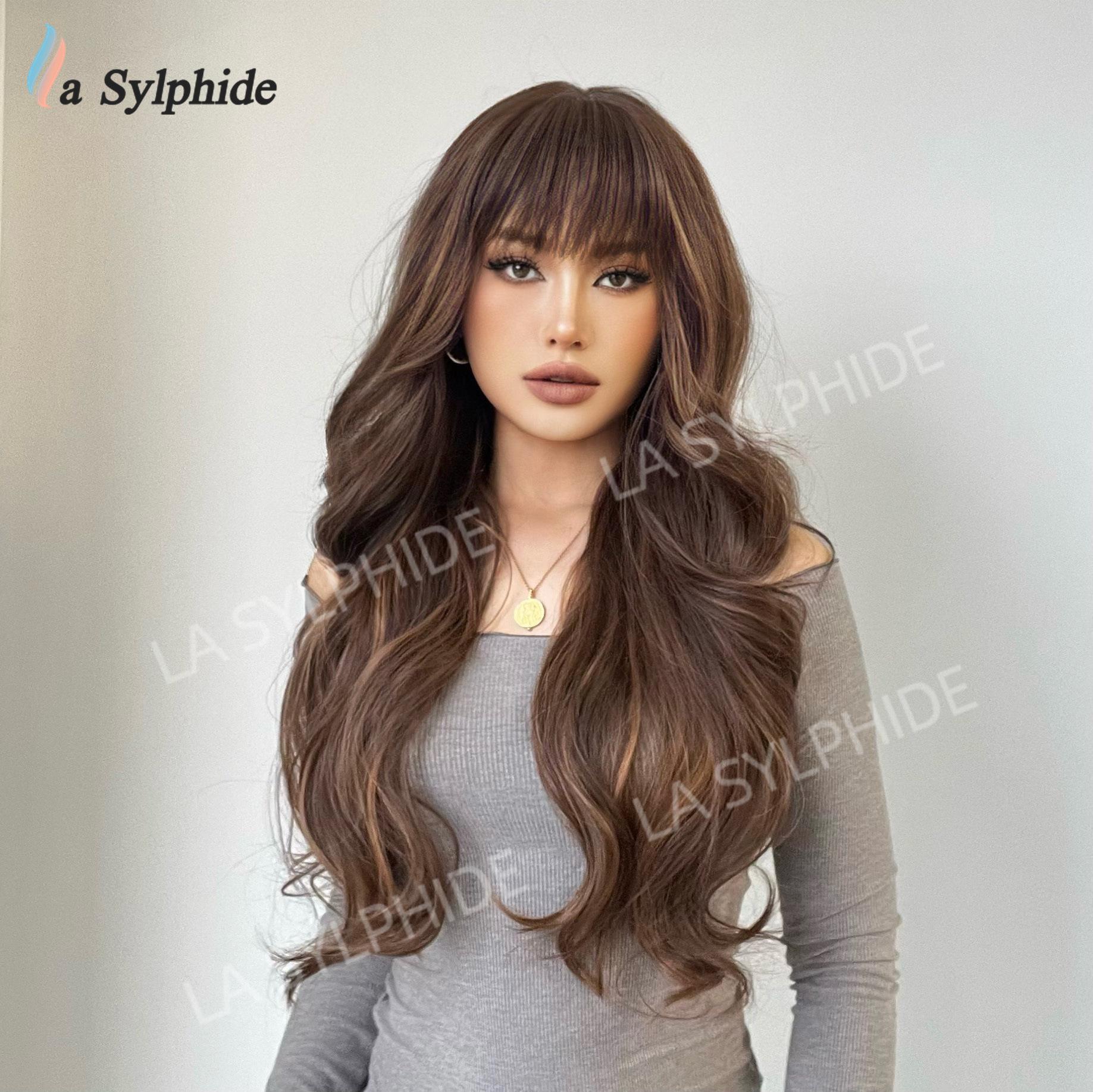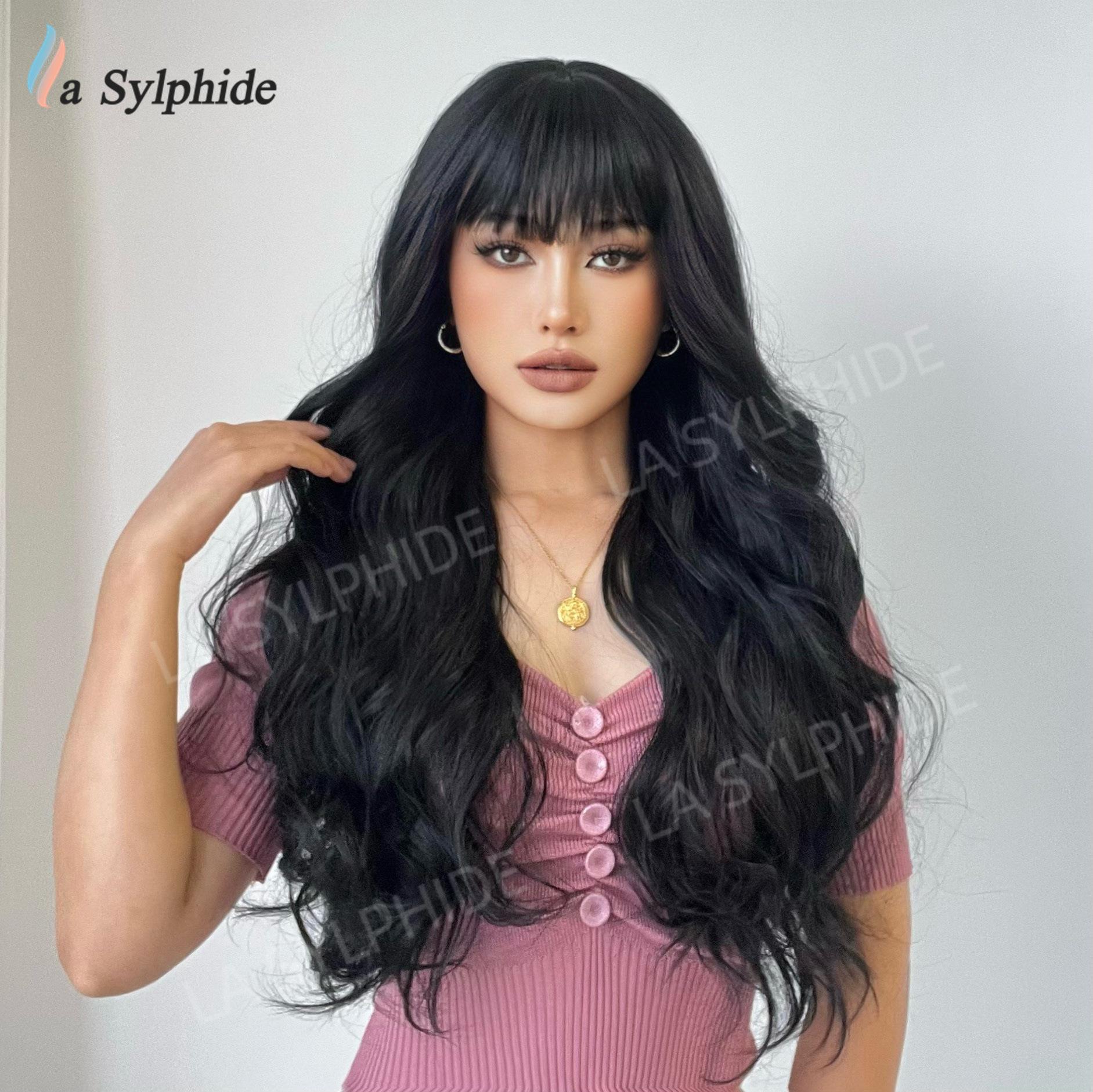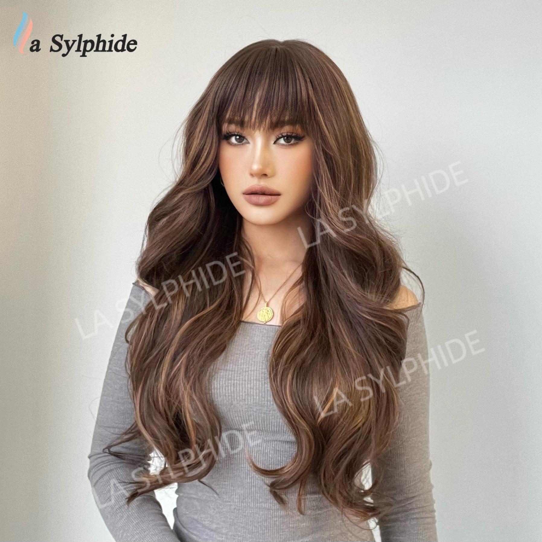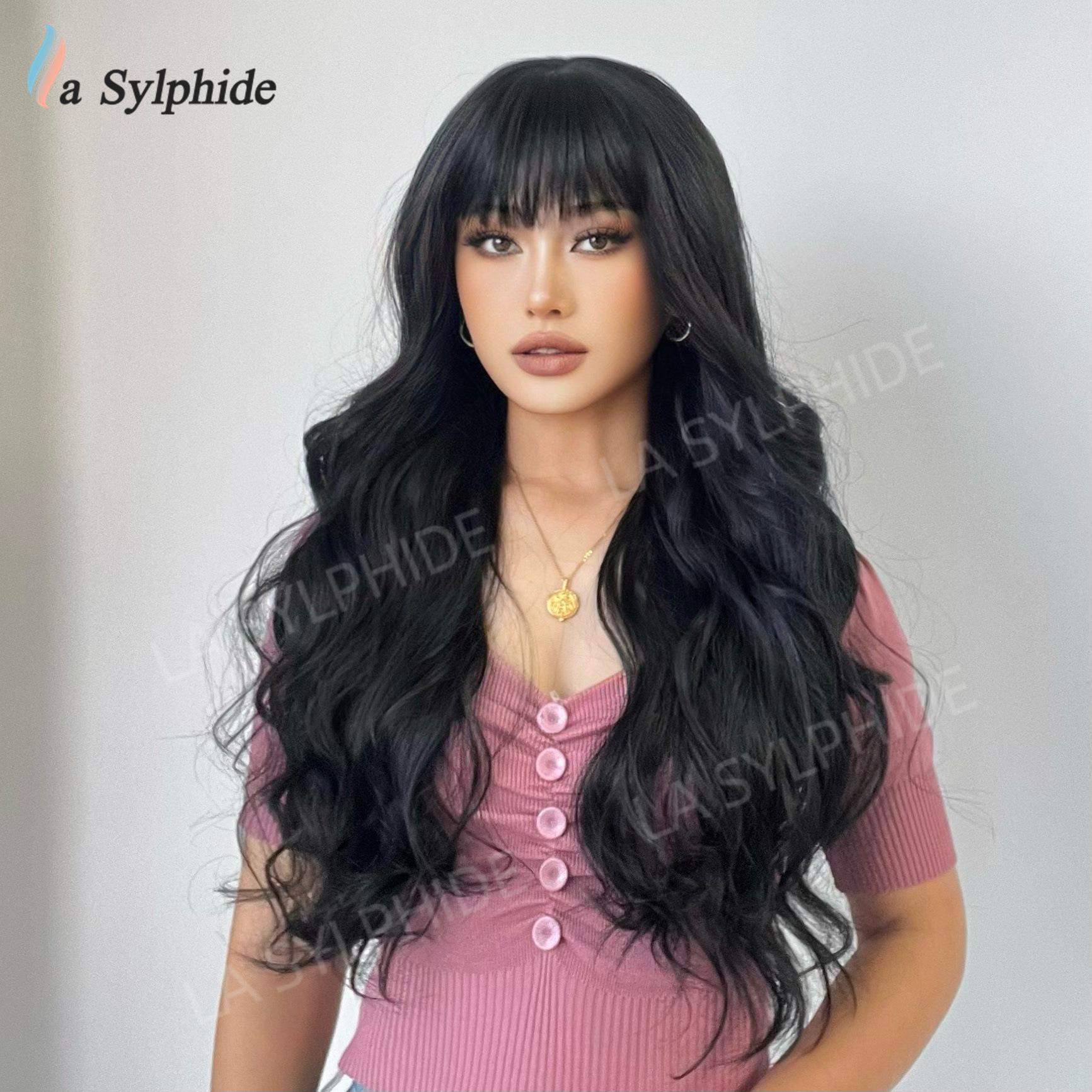 Long curly hair neat bangs