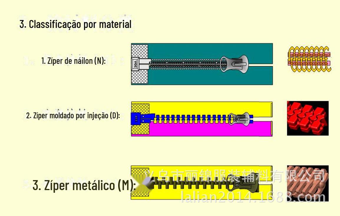 3. Zíperes de metal: zíperes de dente de alumínio, zíperes de dente de cobre (latão, cobre branco, bronze antigo, cobre vermelho, etc.), zíperes pretos.