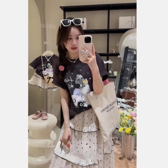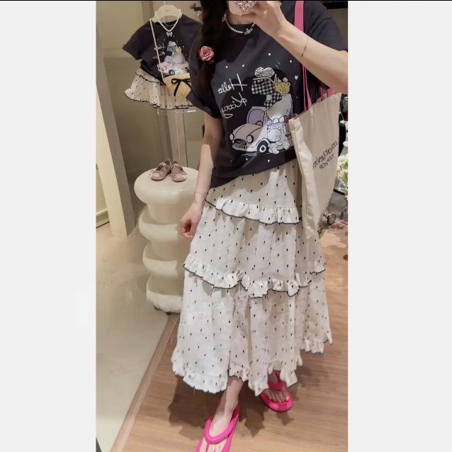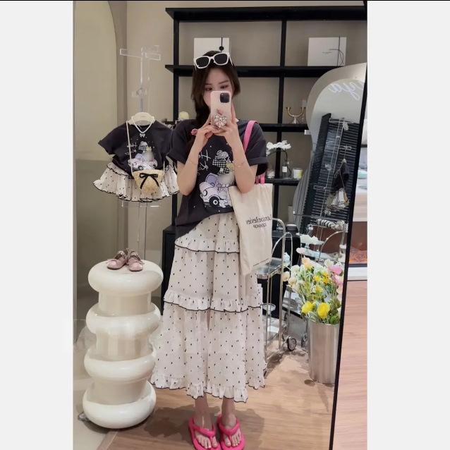 Novo verão Parentage Kitty Gato Estampa T-Shirt Poll Dot Cake Saia Estilo Coreano Mãe e Vestido Feminino Saia babada Lori Saia