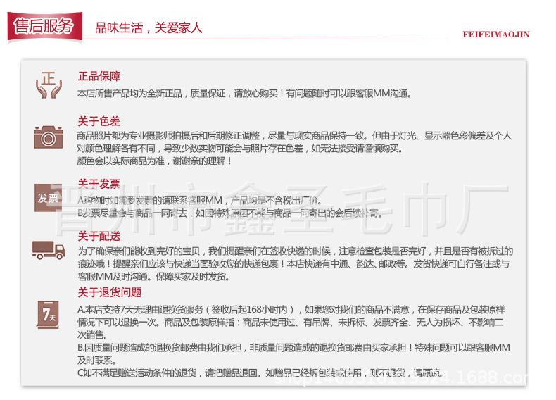 7. Nossa empresa possui um sistema completo de serviço pós-venda. Para proteger os interesses dos clientes, a empresa adota um serviço pós-venda unificado. Quer você compre toalhas online ou em uma loja física, basta ligar para nossa equipe de atendimento ao cliente e aceitaremos sua solicitação de serviço.