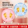Cem dias do bebê, lua cheia, mão e pegada, mesa montada para registrar a pegada de crescimento do bebê, mão do bebê recém-nascido e pegada