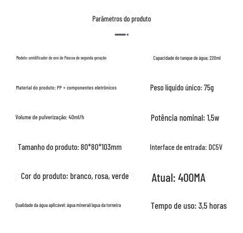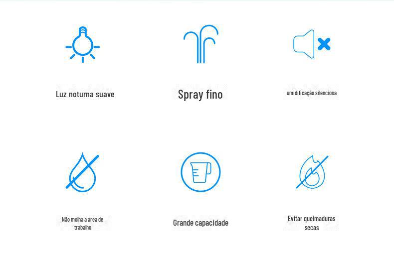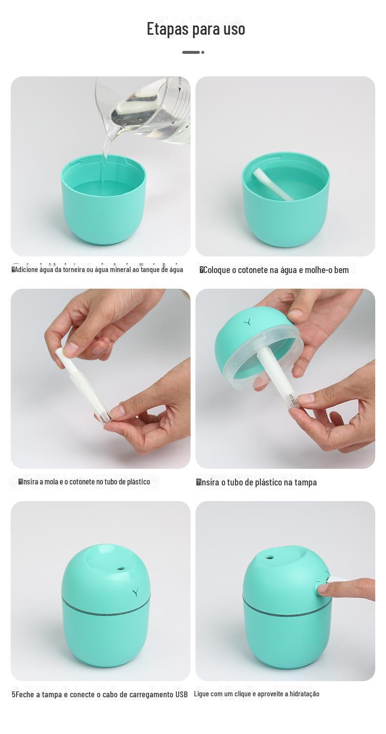 Configuração padrão do produto: Umidificador, Cabo de carregamento USB, Manual de instruções, Embalagem em caixa colorida