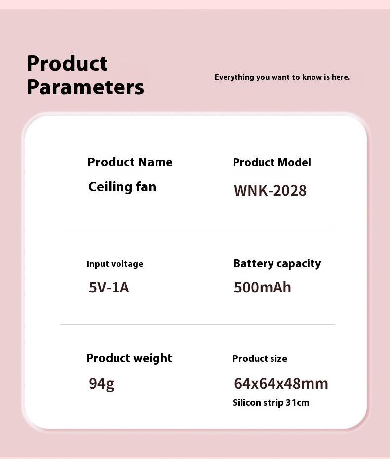 Entrada: DC 5V = 1A Potência de trabalho: 4W Velocidade máxima do ventilador: 3,0 m/s MÁX.