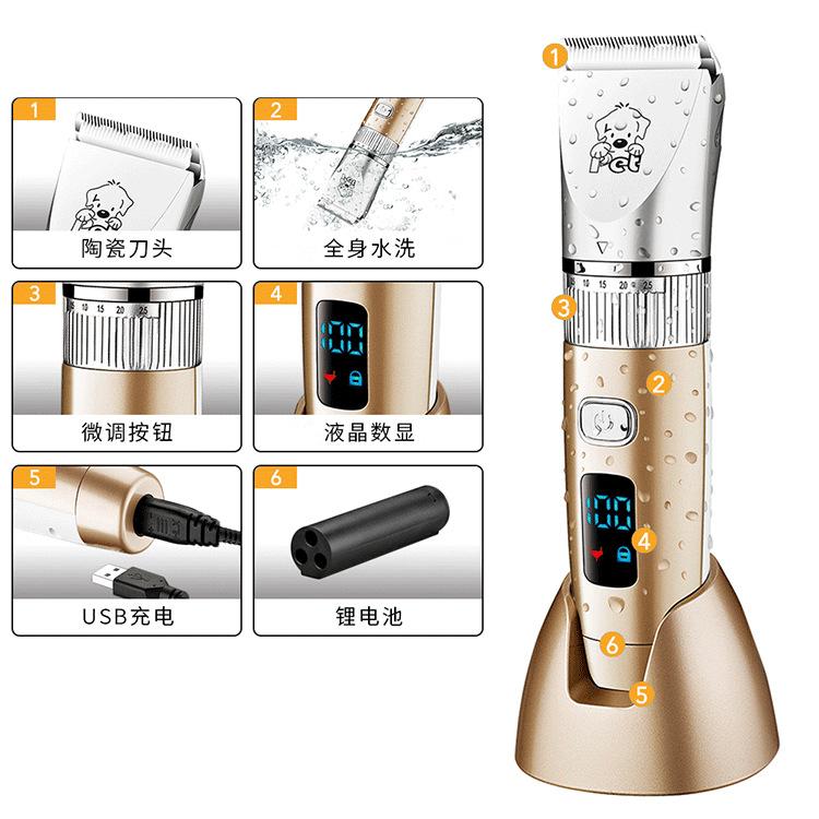 Pontos de venda do produto: barbeador para animais de estimação de alta potência, potência forte, bateria de lítio, carregamento e conexão de dupla finalidade, display digital de cristal líquido LCE, lavagem corporal completa, bateria de longa duração