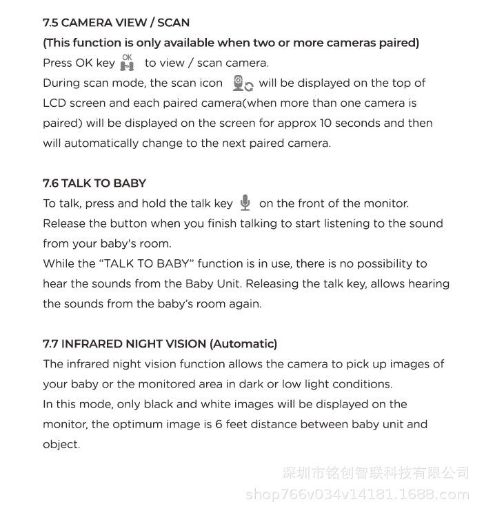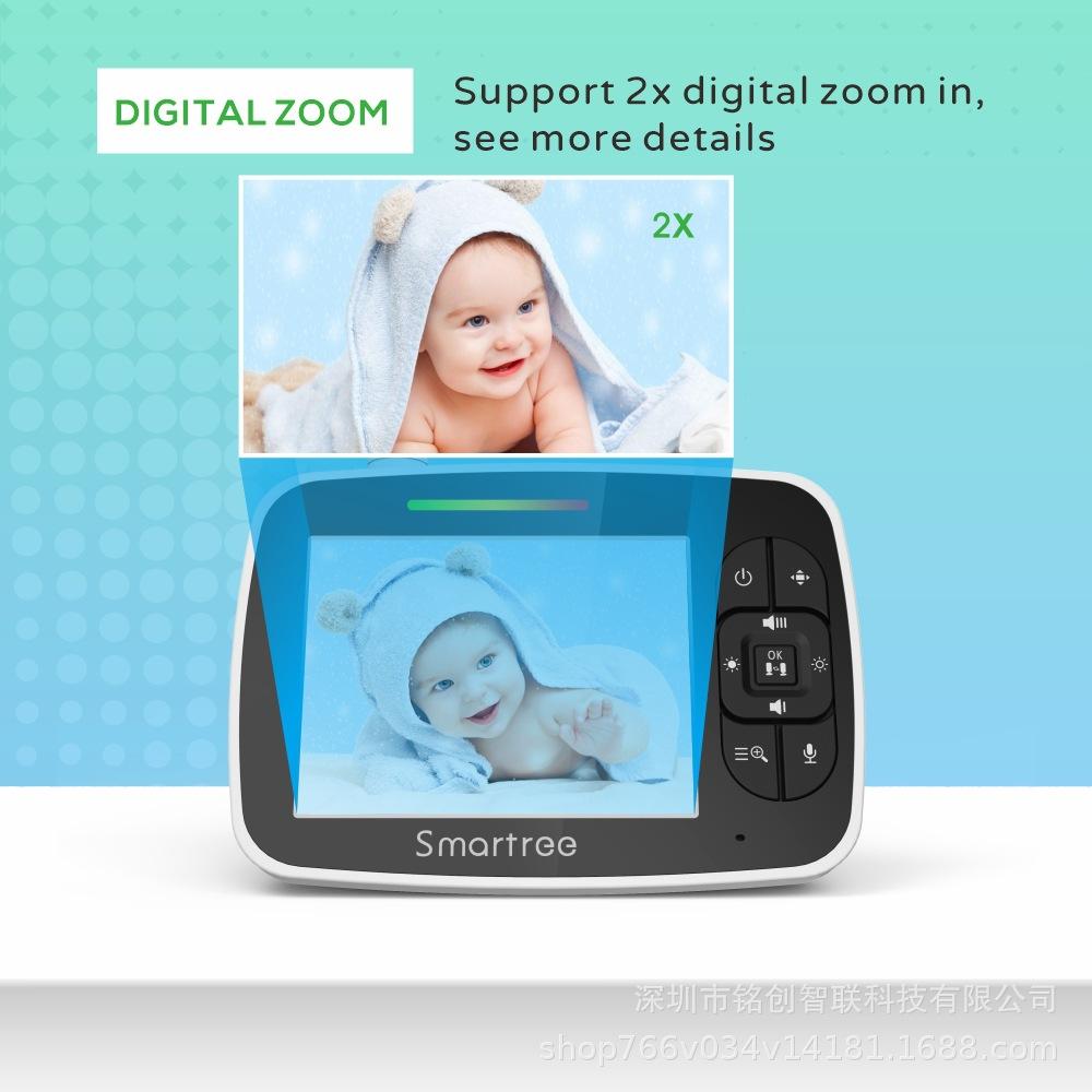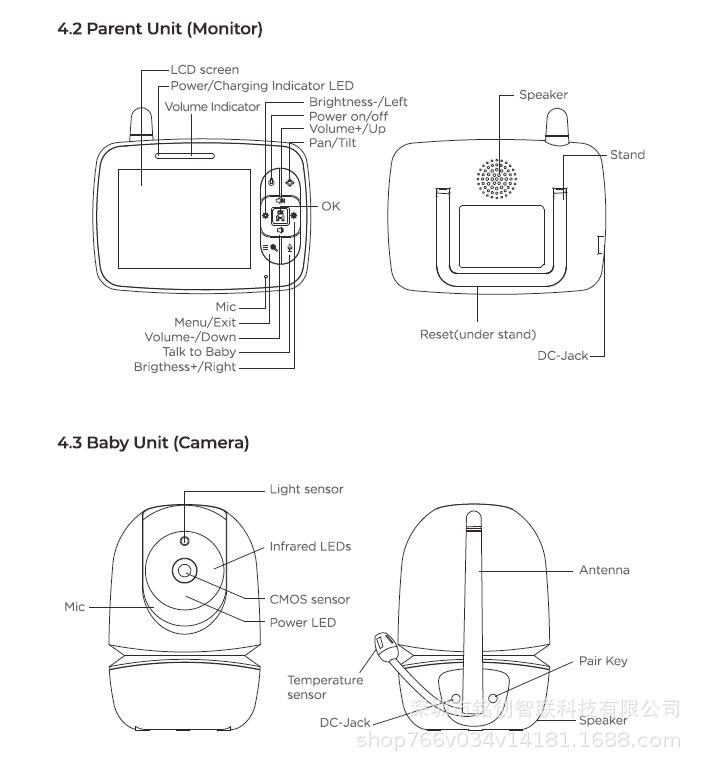 ♥ Intercomunicador bidirecional (extremidade dos pais → extremidade do bebê: pressione e segure o botão do intercomunicador para intercomunicar; extremidade do bebê → extremidade dos pais: transmissão direta)