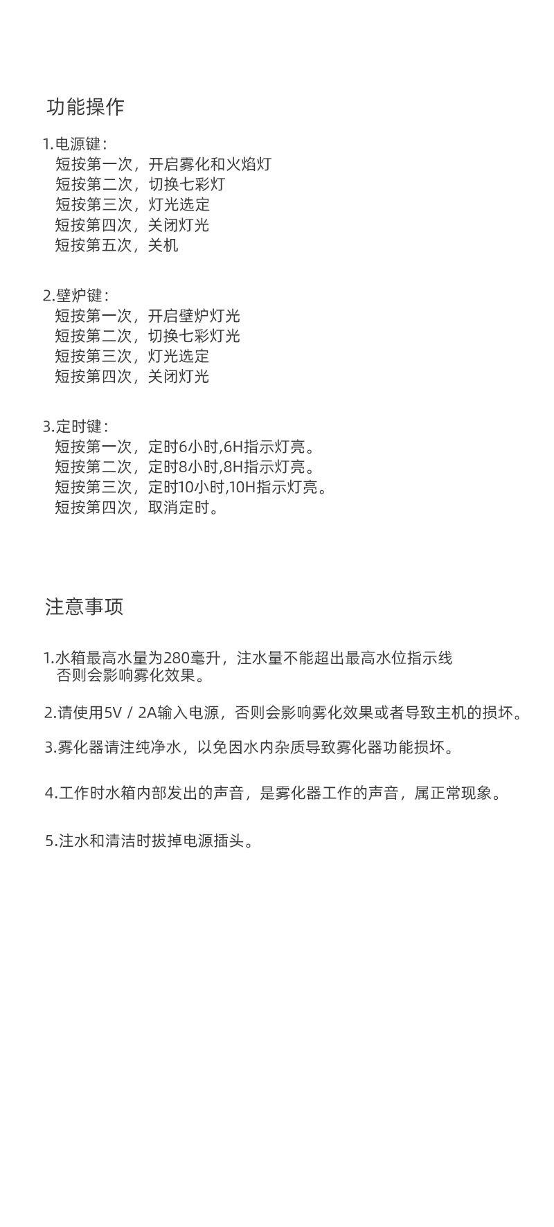 1. Função do botão de spray de luz (botão de energia S2): Pressione uma vez para começar a pulverizar, iniciar o motor regulador de velocidade e as luzes coloridas de chama dos dois painéis de luz (lâmpada de spray e lâmpada de lareira) acenderão; pressione a segunda vez para começar a pulverizar e as luzes de sete cores mudarão (azul, roxo, vermelho, laranja, amarelo, verde, ciano, branco); pressione a terceira vez para começar a pulverizar e fixar a cor; pressione a quarta vez para desligar a luz de spray; pressione a quinta vez para desligar