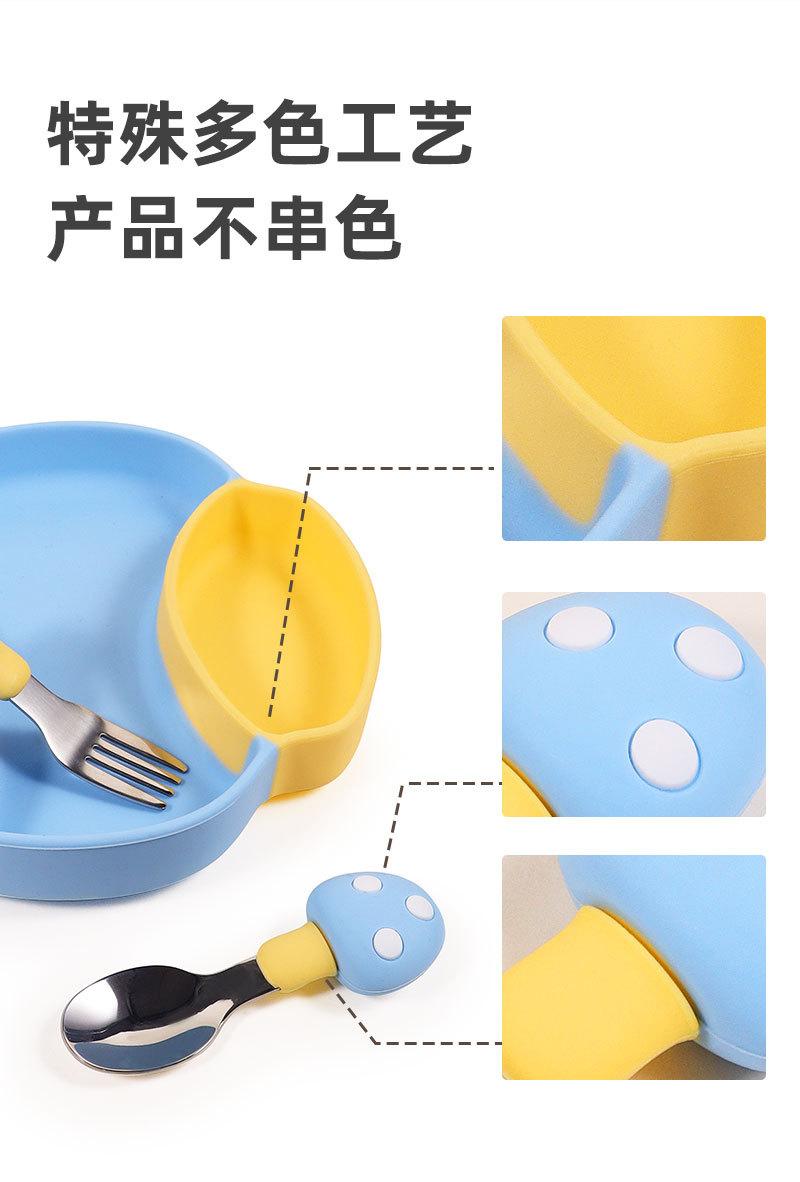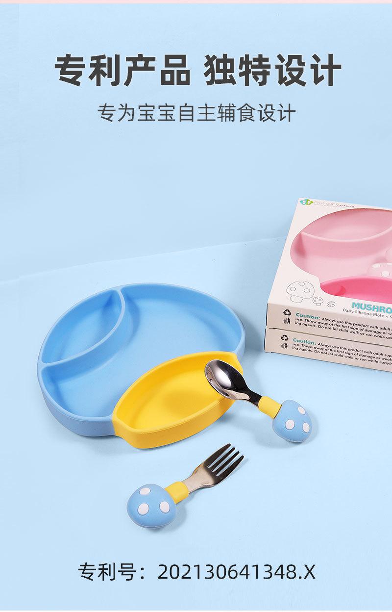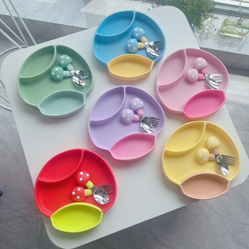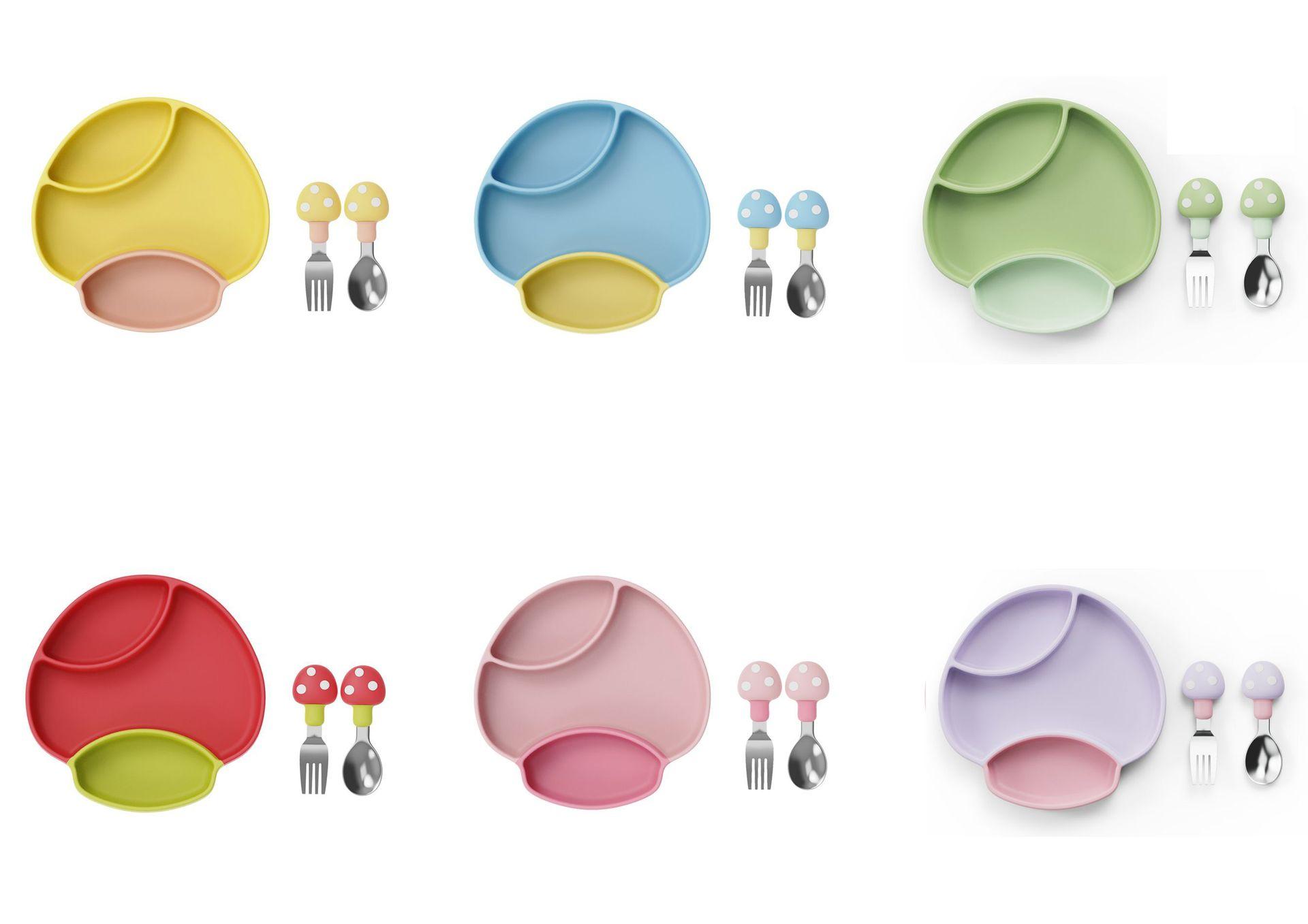 (Novas vendas diretas) Conjunto de colher de garfo de silicone de cogumelo de duas cores para bebê dividido ventosa comida complementar talheres infantis