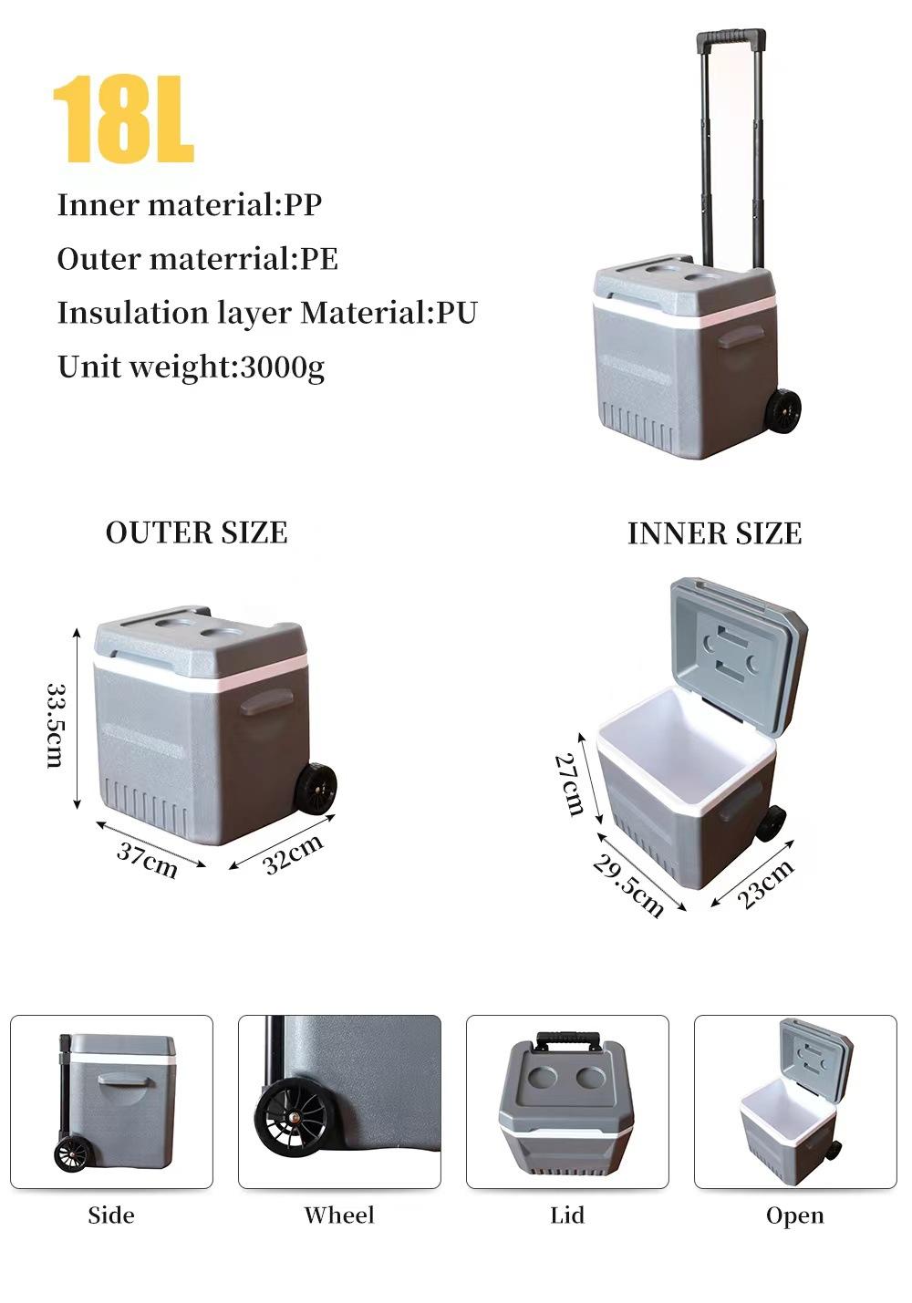 A nova caixa isolada 18L é feita de espuma PU, com tamanho de produto de 37*32*33,5cm, 4 peças por caixa. O tamanho da caixa é 65*39*72cm.