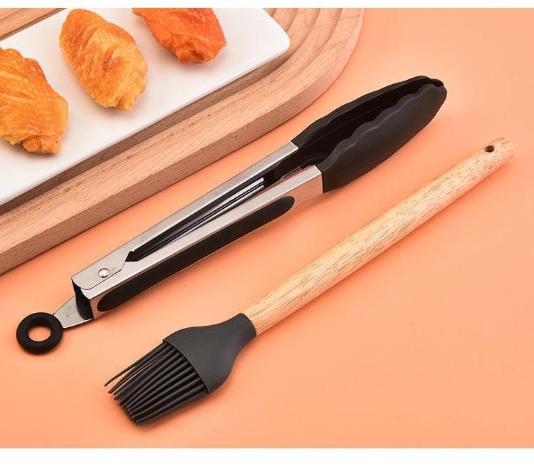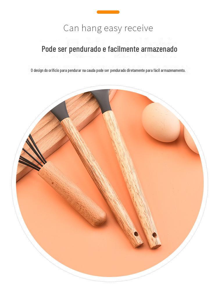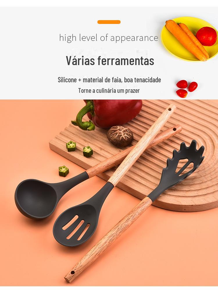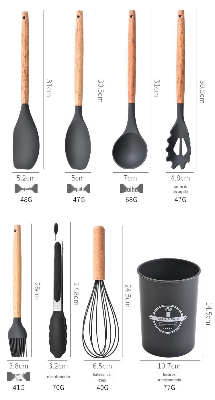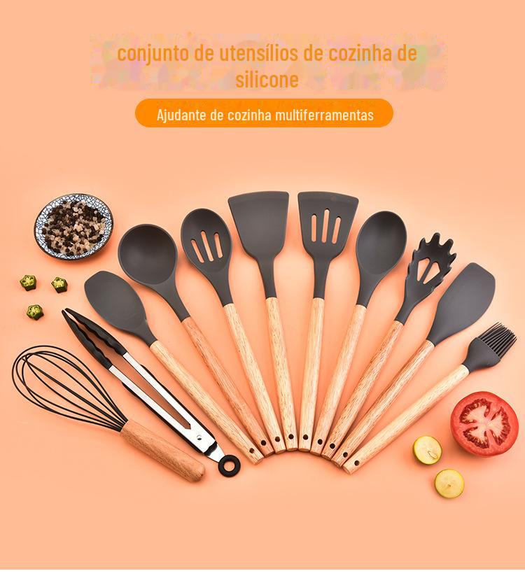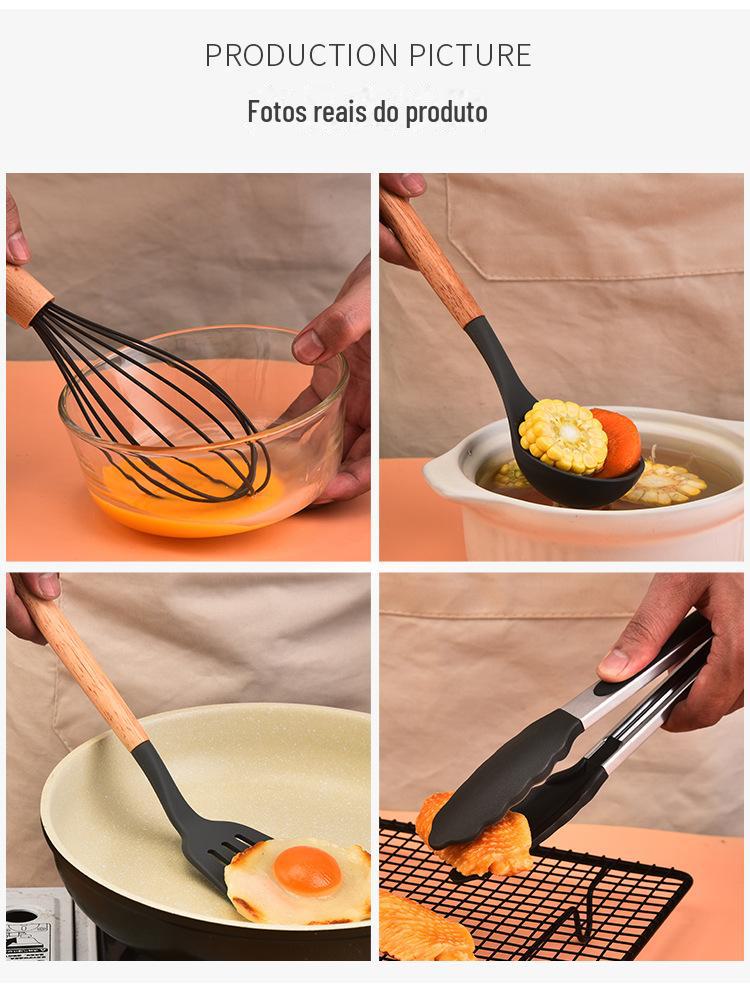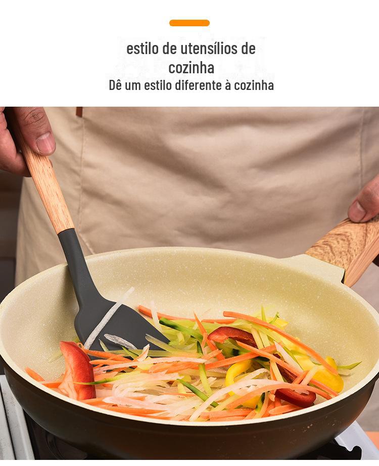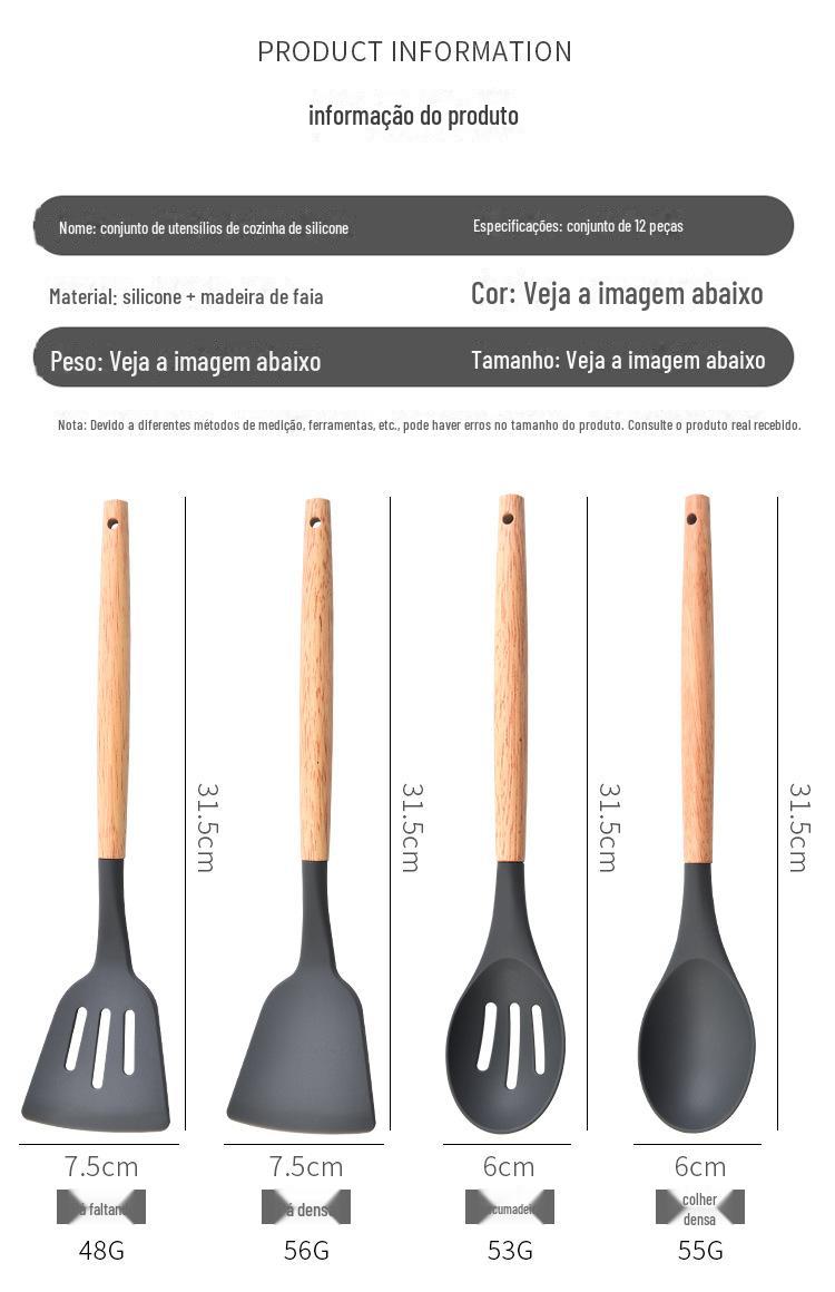 Conjunto de utensílios de cozinha de silicone com 12 peças, cabo de madeira, utensílios de cozinha de silicone, combinação multiuso, pá de cozinha, colher, pá de silicone para cozinha