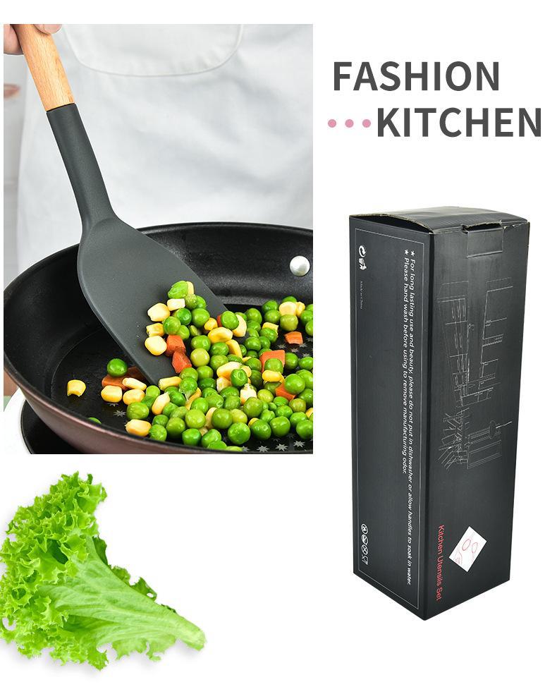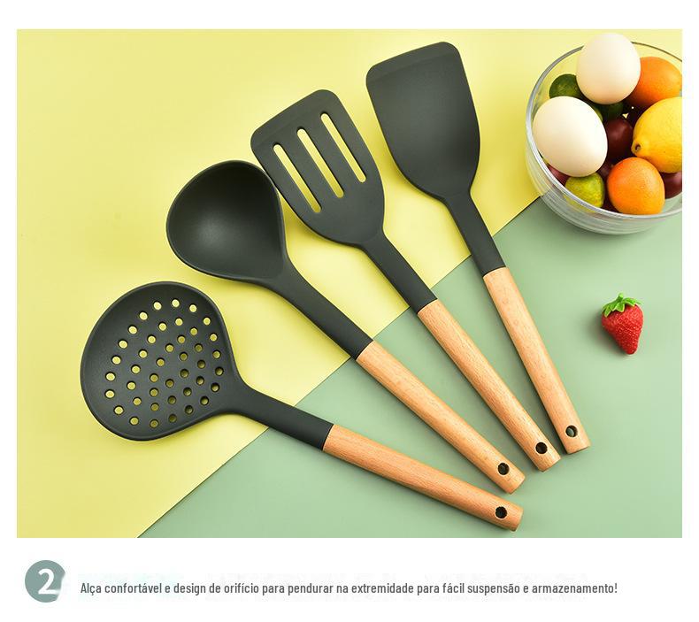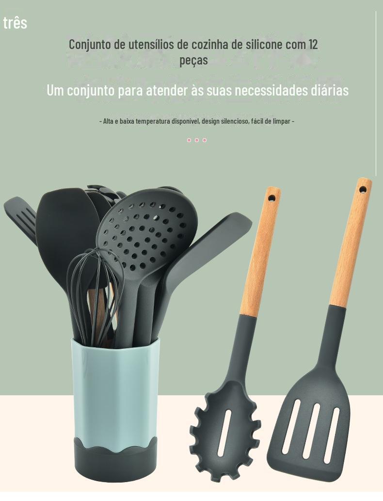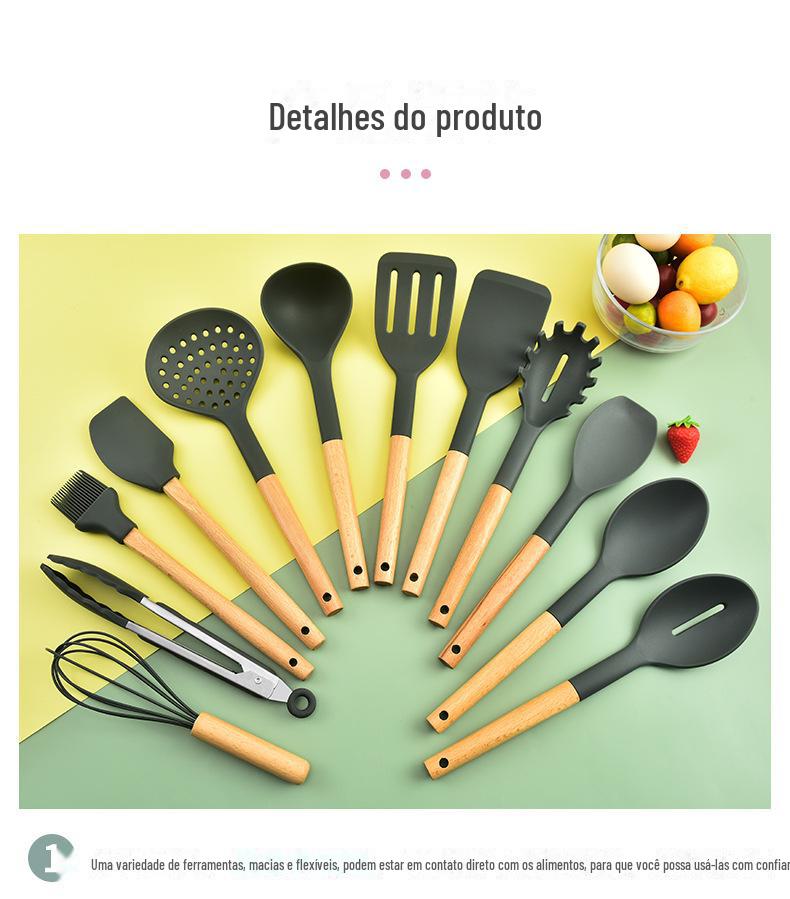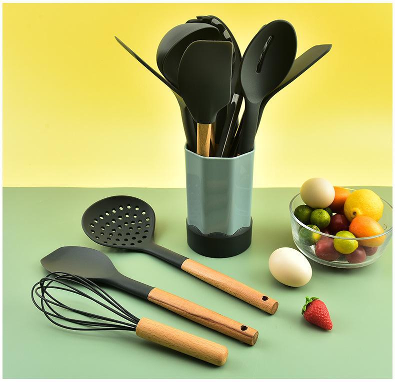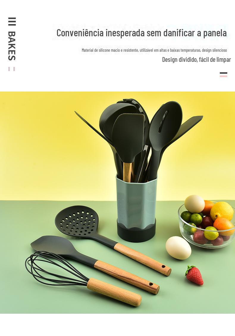 Puxador de madeira espátula de silicone colher de cozinha utensílios de cozinha conjunto de 11 peças barril de armazenamento de silicone utensílios de cozinha conjunto de 12 peças