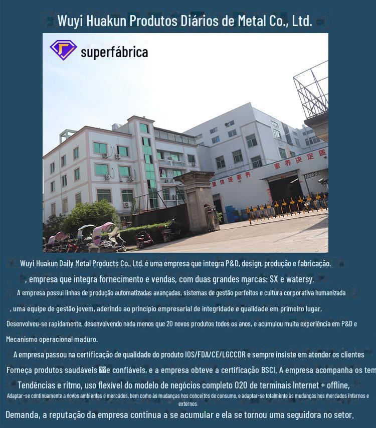 Wuyi Huakun Daily Metal Products Co., Ltd. está localizada em Yongkang, Zhejiang, a capital do hardware. Em 2021, a área da fábrica era de mais de 20.000 metros quadrados, com mais de 500 funcionários, 18 equipes técnicas e 50 equipes de vendas. A empresa concluiu a produção automatizada em 2021 e é proficiente em operação. A produção diária pode chegar a 50.000 xícaras acabadas. Possui uma forte equipe de pesquisa científica, uma equipe de gestão jovem e uma forte rede de vendas. A empresa cresce rapidamente todos os anos, a sua qualidade e reputação continuam a crescer e a escala da empresa continua a crescer, graças às operações de gestão científica e aos conceitos avançados de serviços e ao bom controlo de qualidade dos produtos. Atualmente, muitos dos produtos da empresa passaram na certificação FDA dos EUA, certificação europeia LFGB, certificação de gerenciamento de qualidade IS9001, certificado CE, teste de certificação francês DGCCFR, inspeção de fábrica BSCI e outros certificados de qualidade. Bem-vindo a visitar!!!