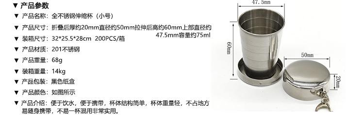 Nota: Copos telescópicos podem ser usados para conter vinho estrangeiro e vinho branco, mas não vinho tinto ou bebidas carbonatadas. Ao mesmo tempo, é melhor não usar líquidos com cheiros fortes e pungentes.Além disso, tenha cuidado para não queimar as mãos se usar um copo dobrável para segurar água quente, pois o material de aço inoxidável é muito condutor de calor.