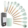 Atacado barril de armazenamento verde claro cabo de madeira silicone utensílios de cozinha 11 peças antiaderente pá conjunto de utensílios de cozinha 11 peças conjunto