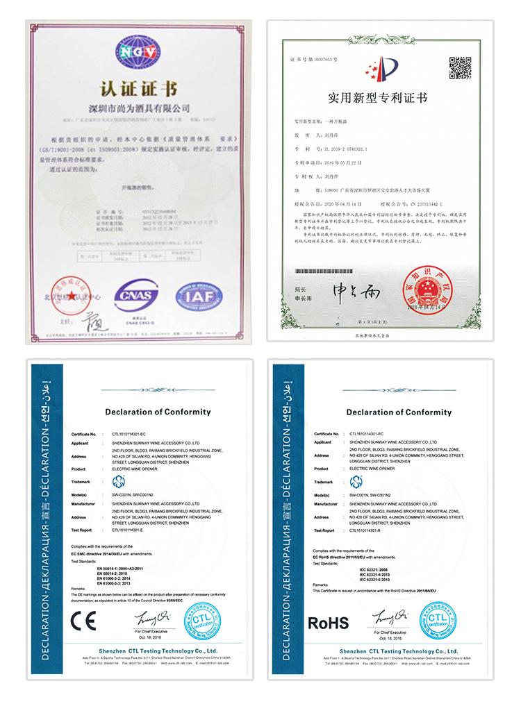 5. Vantagem de qualidade: Somos um fabricante nacional de artigos para vinho que passou pelo sistema de gestão de qualidade ISO. Nossos produtos têm várias certificações autorizadas (FDA\LFGB\CE\ROHS\SGS) e relatórios oficiais de inspeção de qualidade (Shenzhen City and Quality Inspection Bureau).