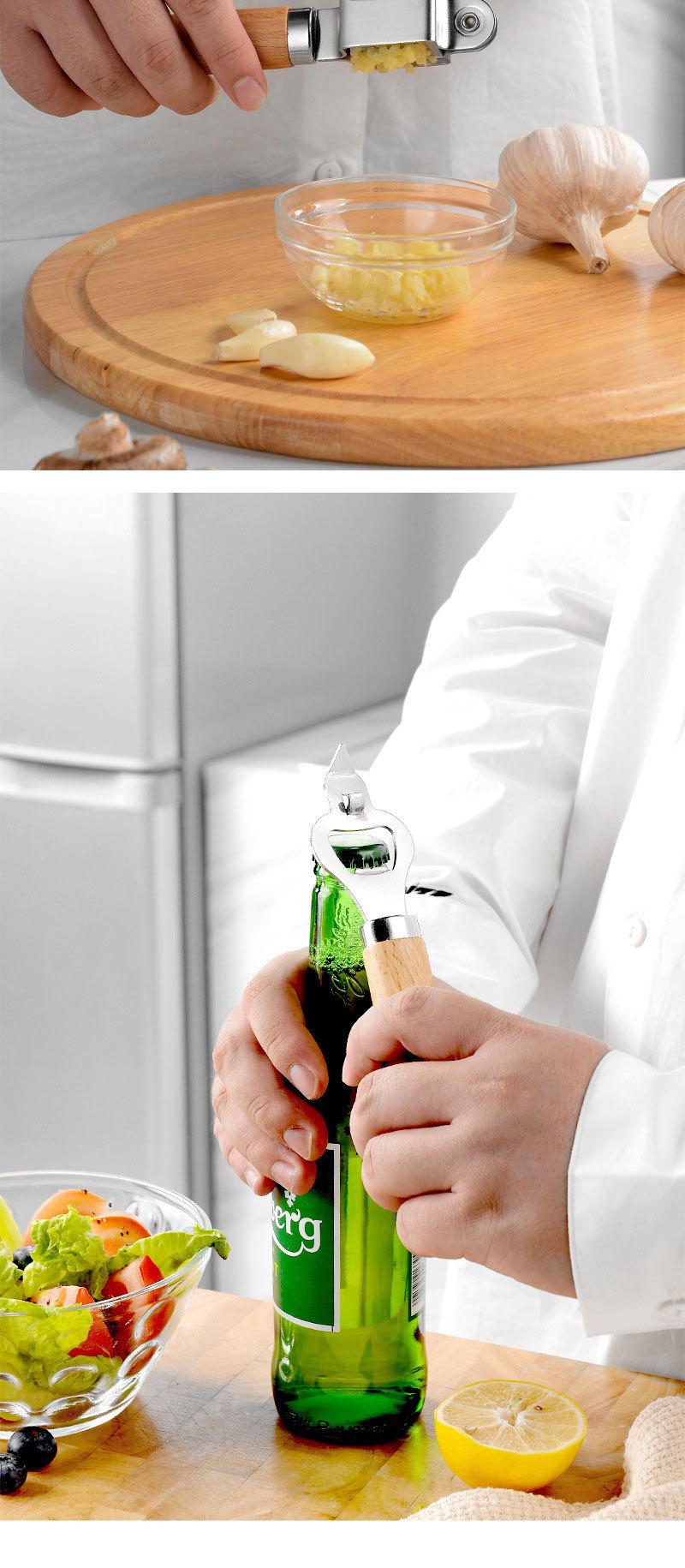 Abridor de latas: 170g. Faca de queijo: 63g. Espremedor de alho: 143g.