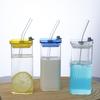 Copo de sucção colorido de vidro quadrado com tampa Copo de sucção transparente de alto borosilicato Copo de suco de bebida fria doméstica Xícara de café