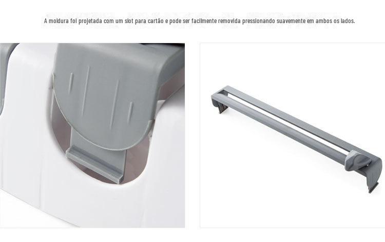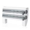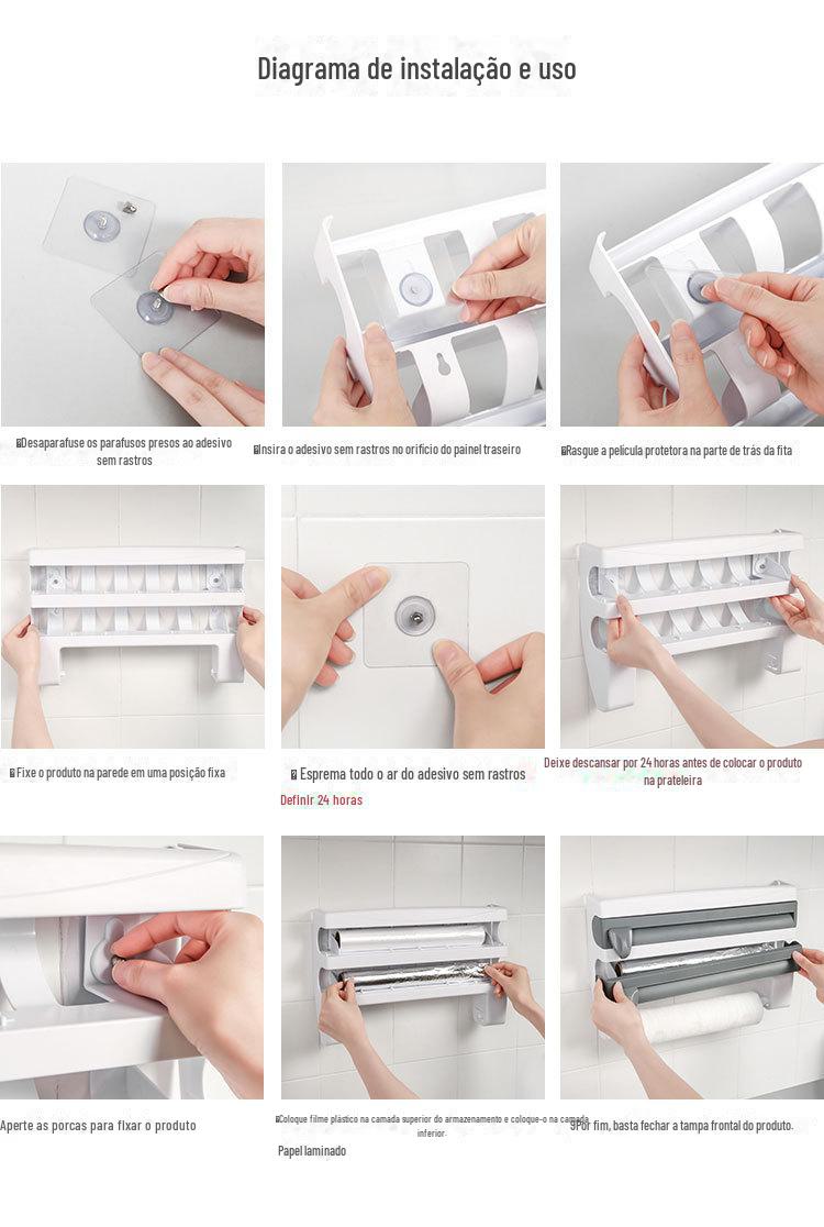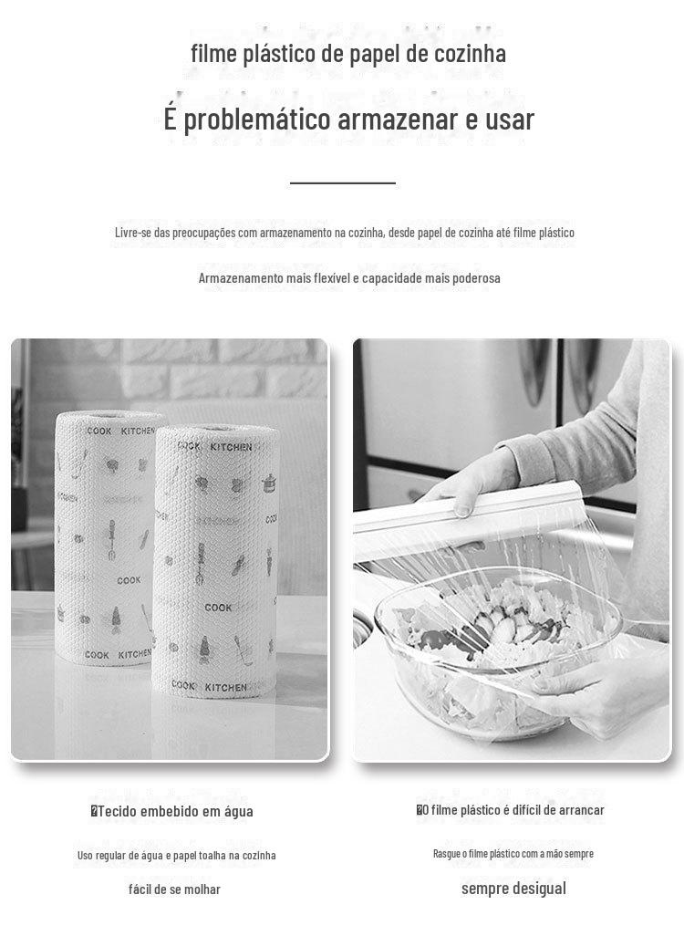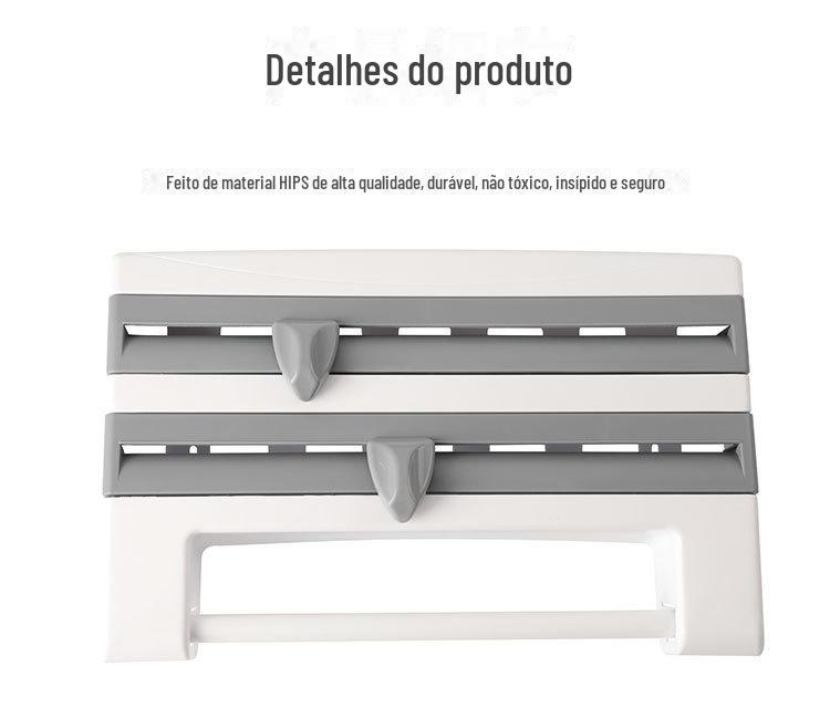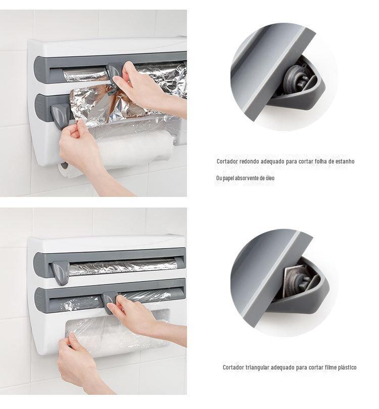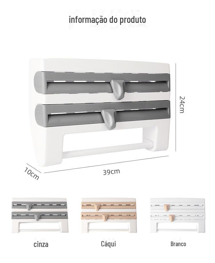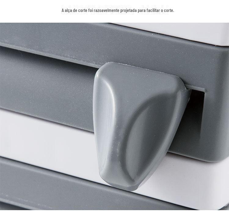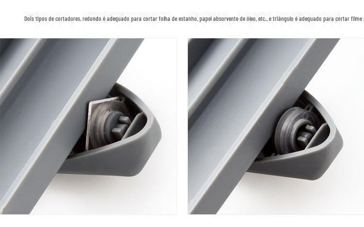 Este produto pode armazenar filme plástico, papel alumínio, toalhas de papel, etc., e possui 2 facas de corte integradas: um cortador triangular e um cortador circular.