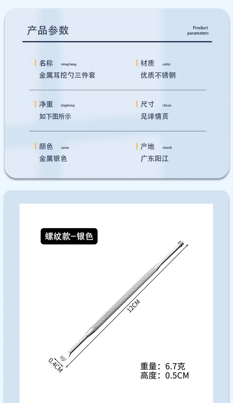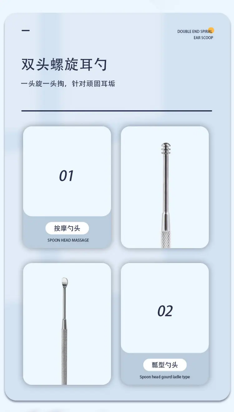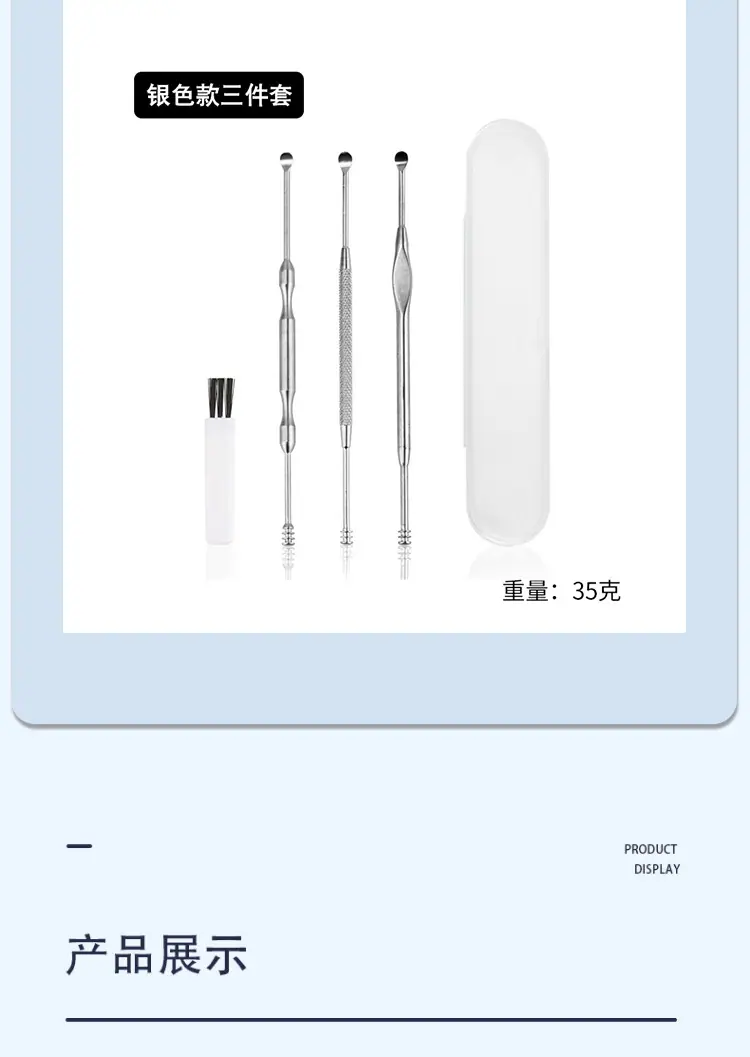 Fábrica de aço inoxidável orelha escavando colher 3 peças conjunto espiral cabeça dupla orelha escavando colher limpeza sujeira orelha conjunto ferramenta de coleta