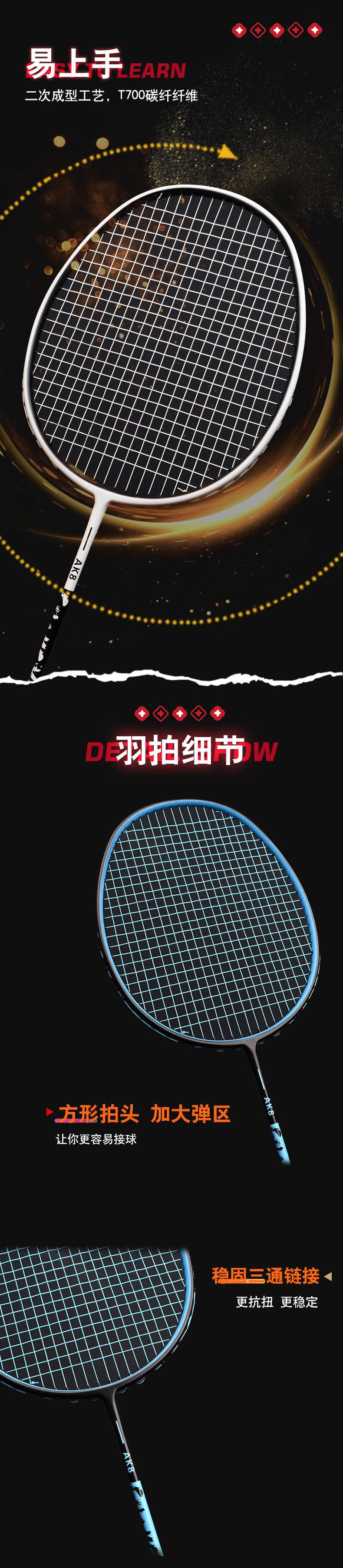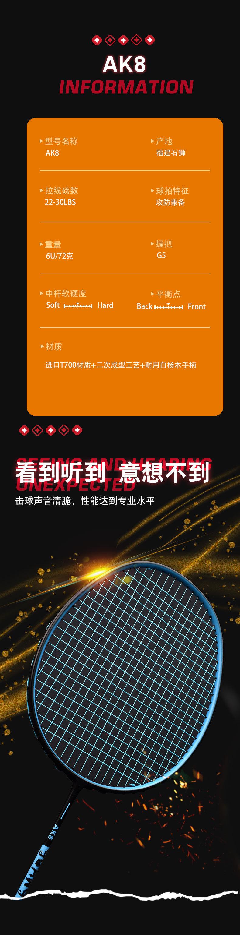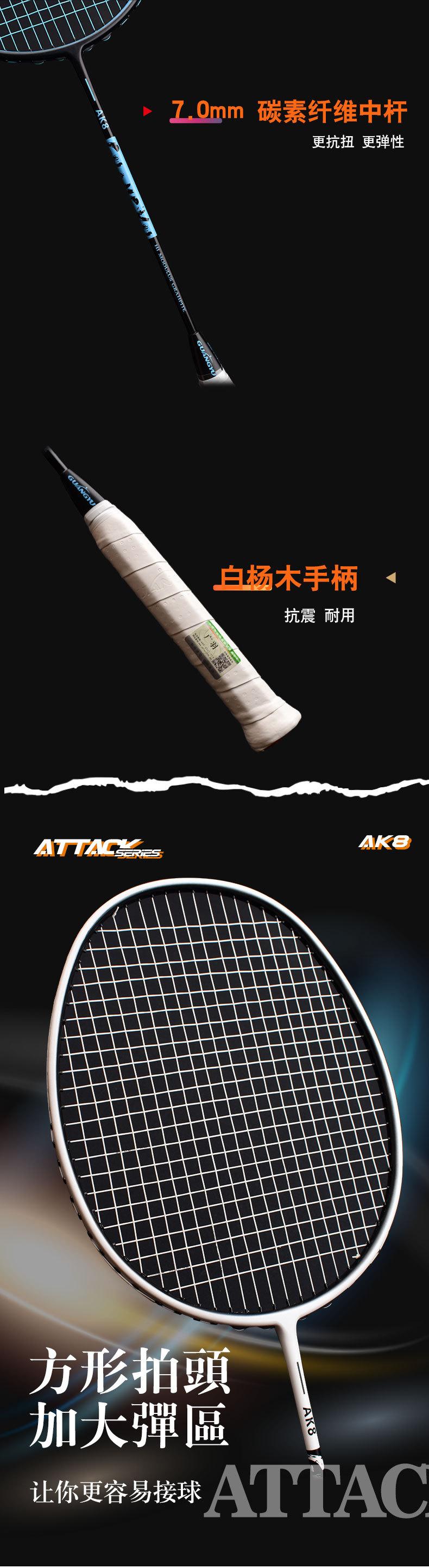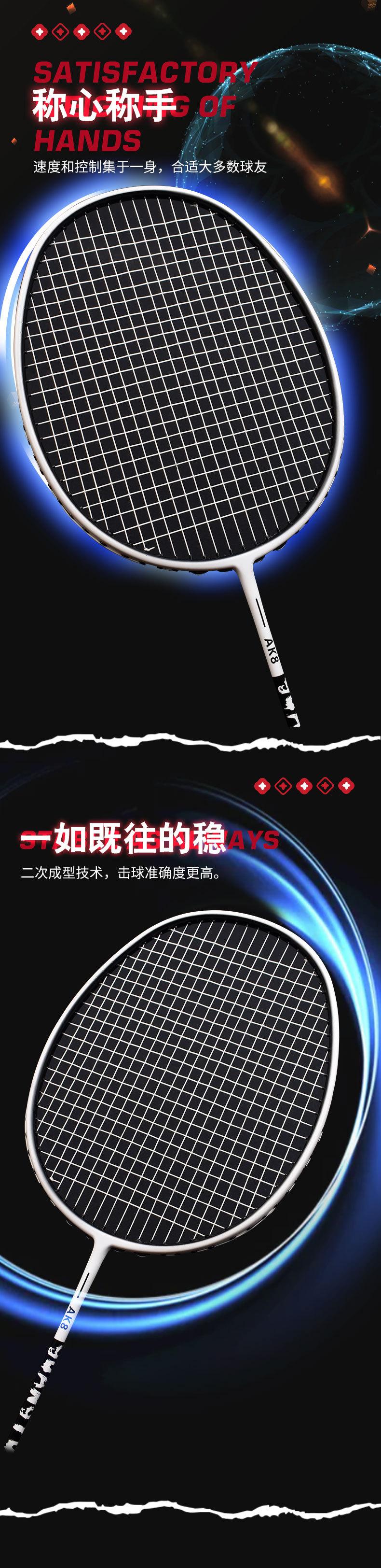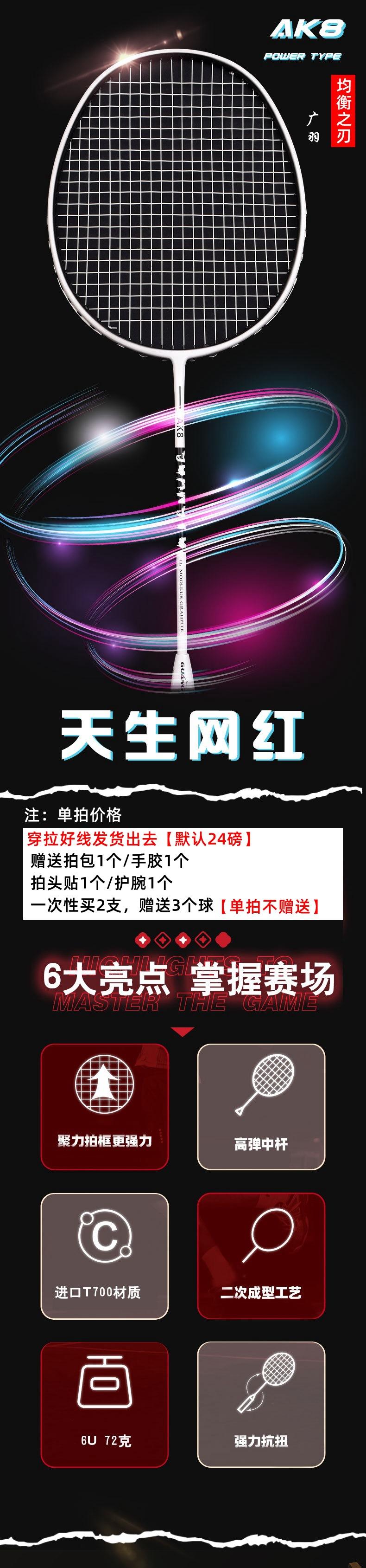 Lâmina ofensiva e defensiva da marca Guangyu-AK8, design ultraleve 6U/72g, leve e flexível de usar, pode atacar e defender. A raquete é feita de fibra de carbono T700 e o peso suporta 24-30 libras, o que é adequado para todos os jogadores amadores.