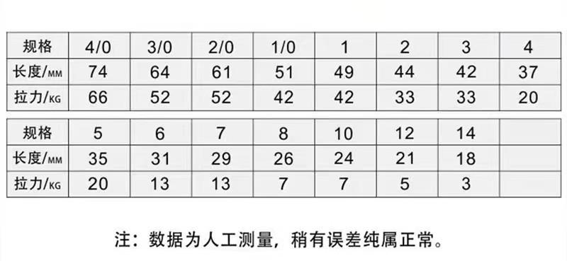 3/0#, 2/0#, 1/0#, 1#, 2#, 3#, 4#, 5#, #6#, 7#, 8#, 10#, 12#, 14#, 4/0#, 5/0#