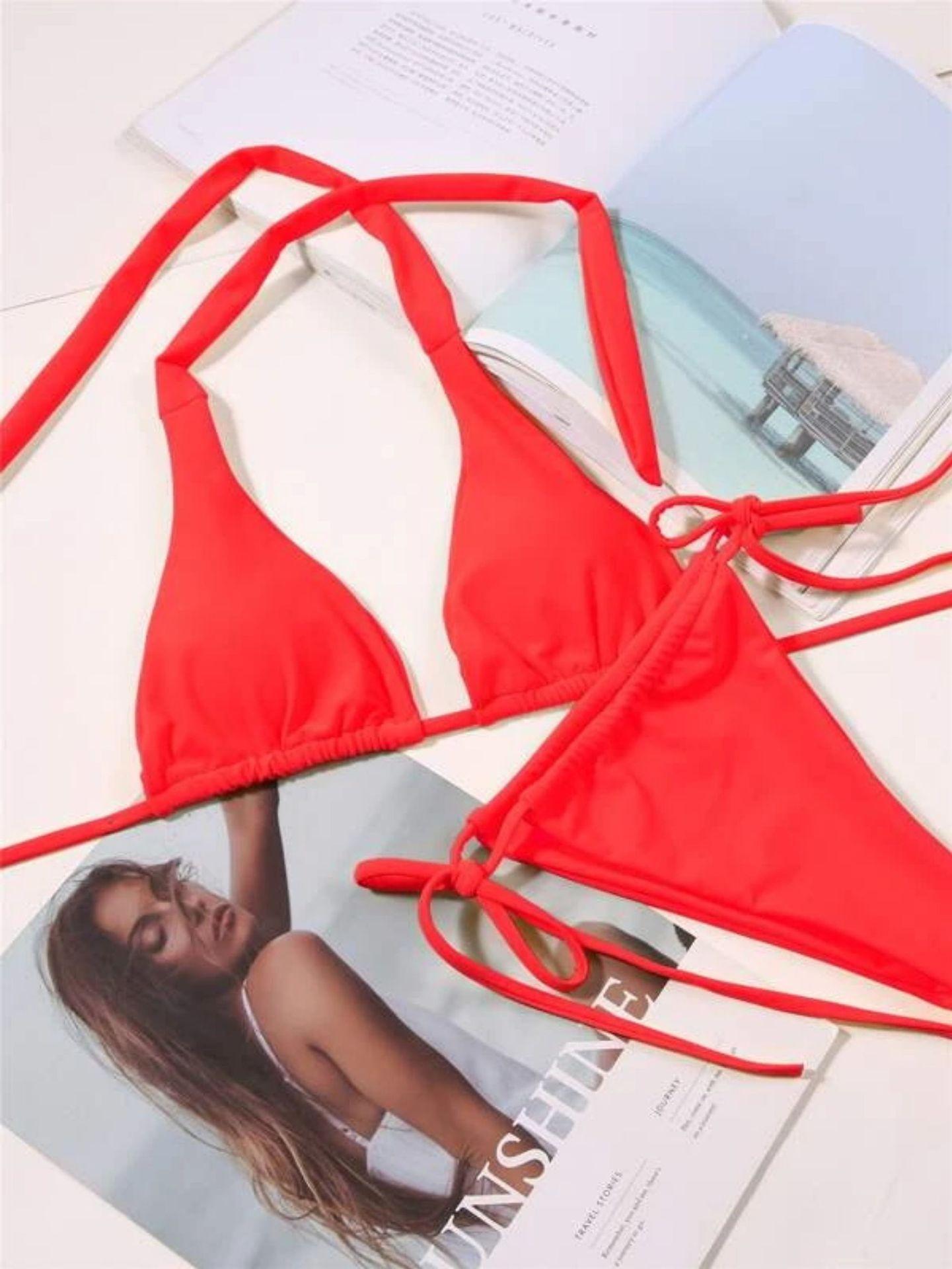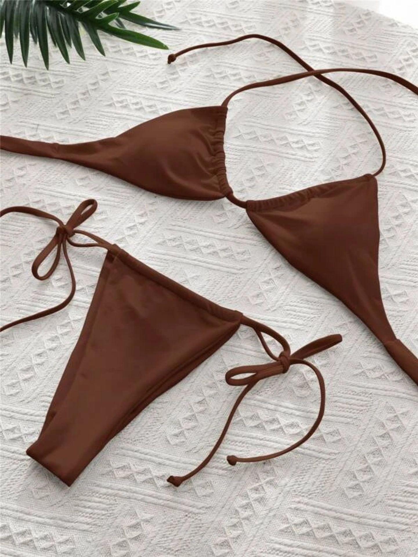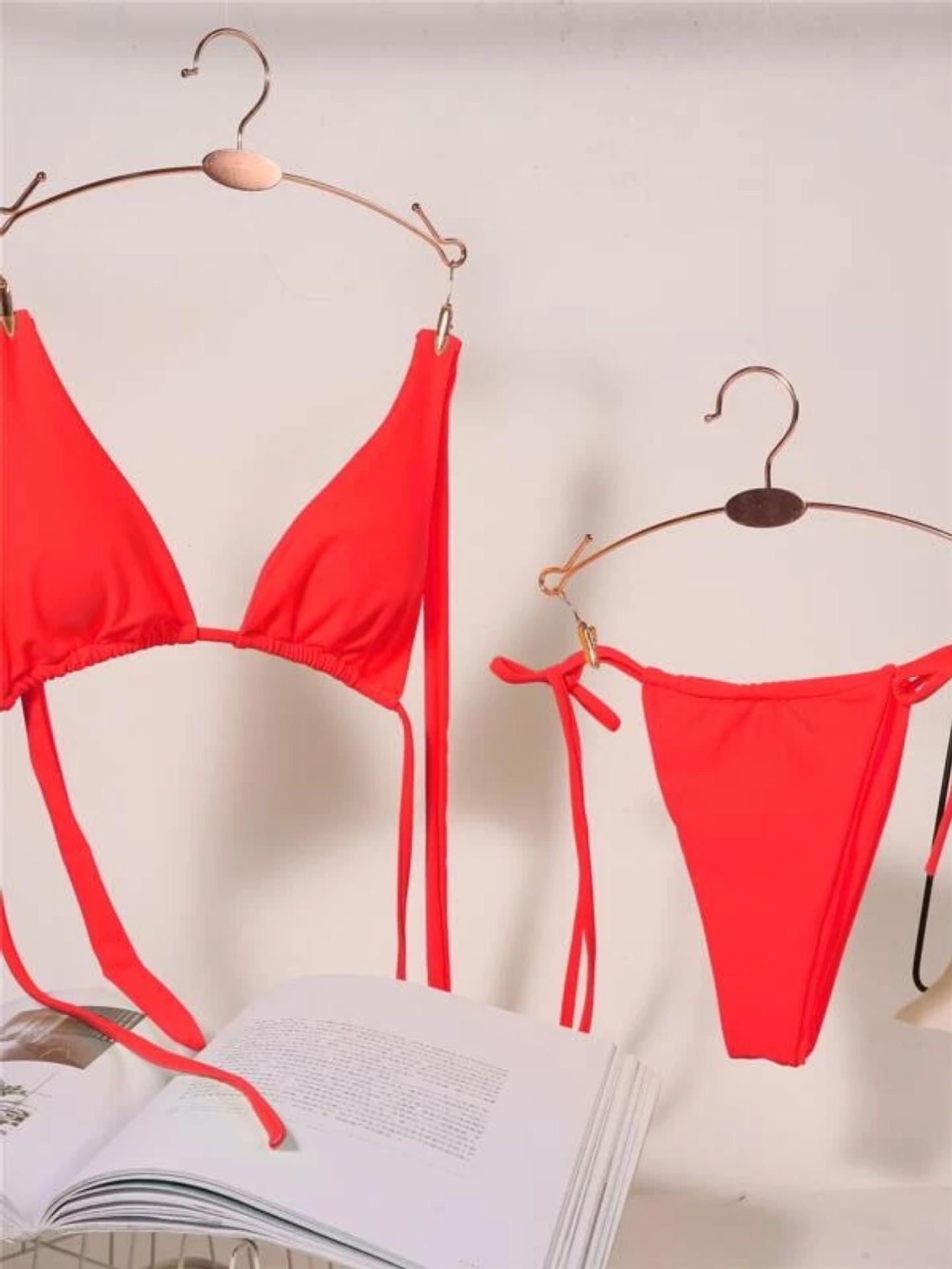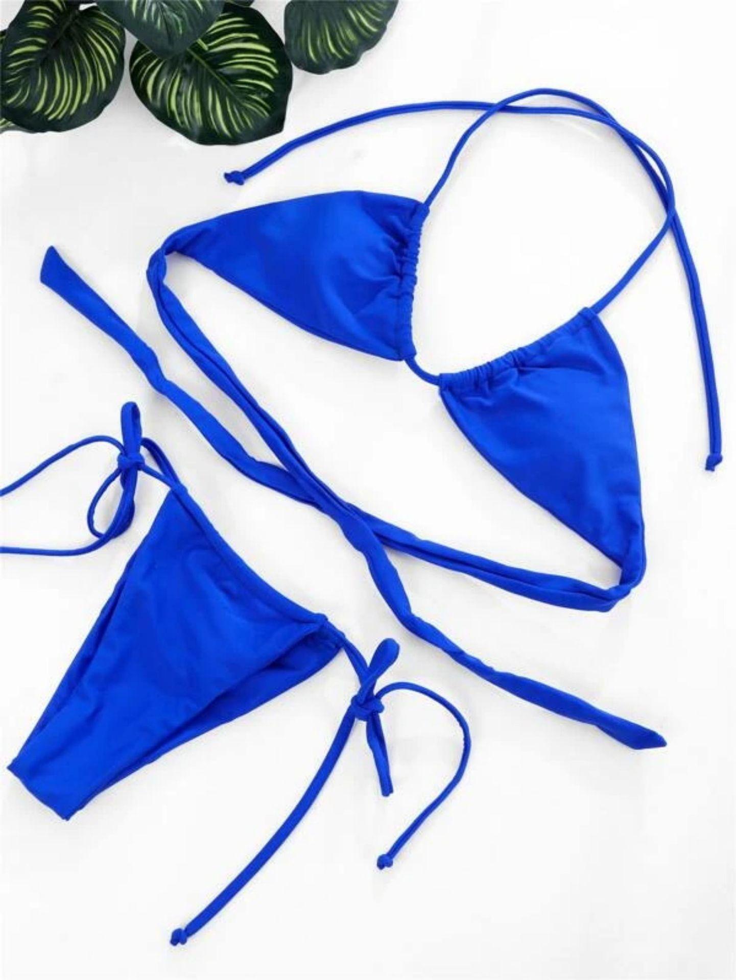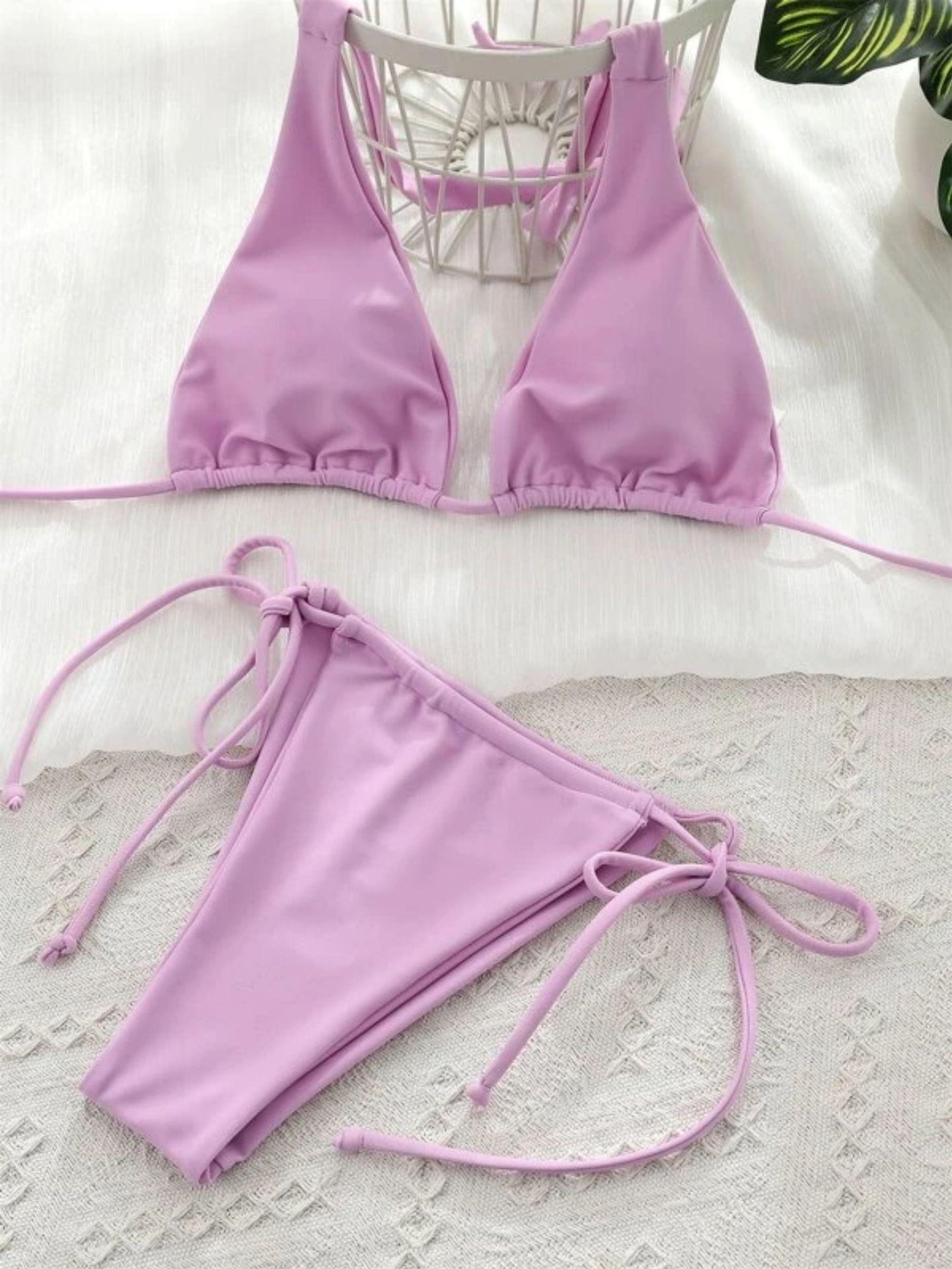 Novo maiô feminino europeu e americano, cor sólida, sexy, alças, costas nuas, fenda profunda, biquíni, praia, férias