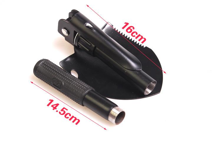 Características: Múltiplos usos, muito adequados para camping, barracas, montanhismo, exploração, viagens, jardinagem doméstica, pesquisa científica e outras atividades ao ar livre. Tem as funções de pá, picareta, serra, ranhura para extração de pregos, etc.