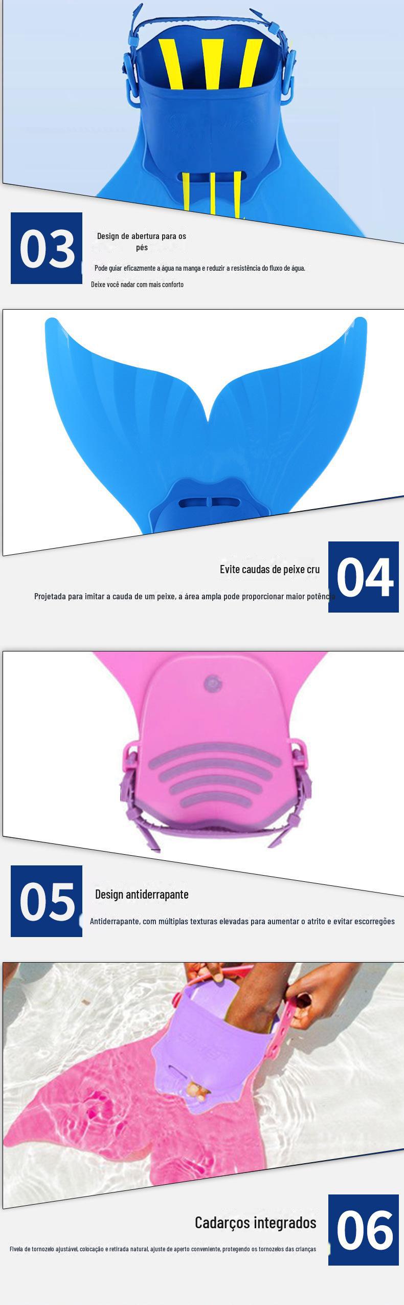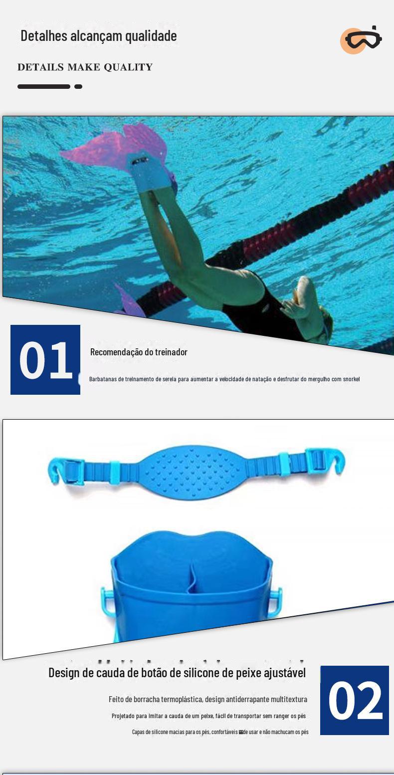 Esta nadadeira de sereia foi projetada para tornar o aprendizado da natação mais divertido para as crianças. Além de aumentar a confiança das crianças na água, também permite que pratiquem chutes de peixe e ritmos corporais.