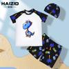 Maiô para meninos, calção de banho, touca de natação, conjunto de três peças, primavera quente, férias, praia, estampa de desenho animado infantil, maiô para meninos
