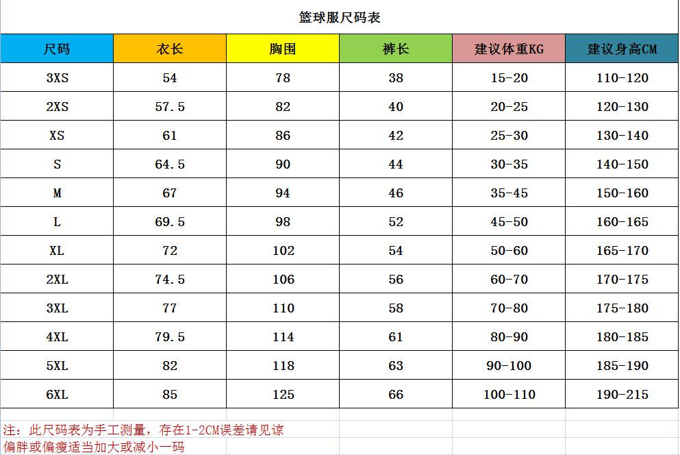 3XS/120, 2XS/130, XS/140, S/145, M/155, L/165, XL/170, 2XL/175, 3XL/180, 4XL/185, 5XL/190, 6XL/195