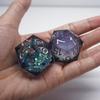 O dado tem arestas e cantos afiados, os números de 20 lados são gravados claramente, e o óleo é aplicado uniformemente.