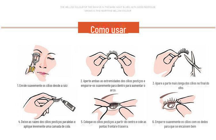 1. Aplique um pouco de cola na borda dos cílios postiços. Após cerca de 3 a 5 minutos, dobre os cílios postiços para torná-los macios.