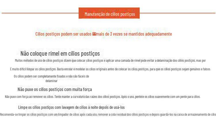 Embora os cílios postiços sejam delicados e requintados, eles são muito frágeis, por isso você deve ter um cuidado especial ao usá-los. Use os dedos para removê-los suavemente na direção dos cílios. Você também pode usar o método de dobrar a caixa com os cílios postiços para frente e para trás para fazê-los cair naturalmente.