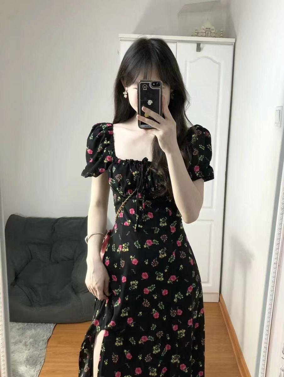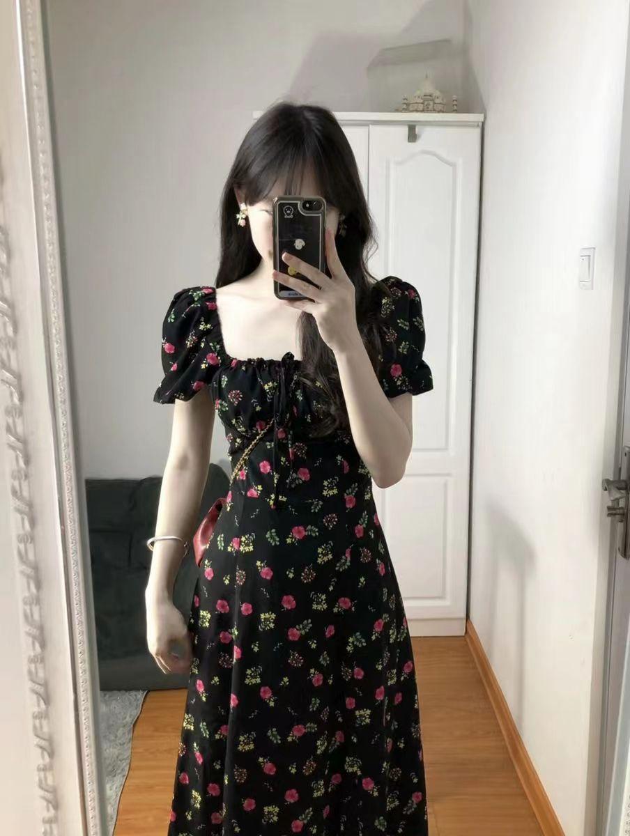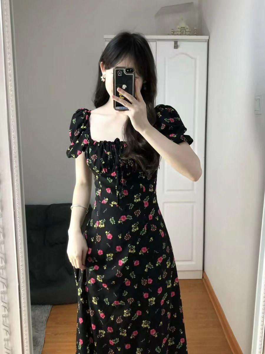 Vestido de manga curta, gola quadrada francesa, cintura fina, elegante, saia em linha A, comprimento médio, saia floral com manga bolha