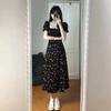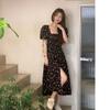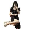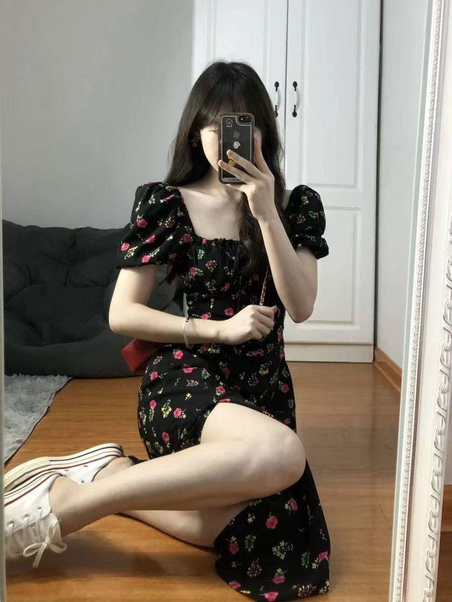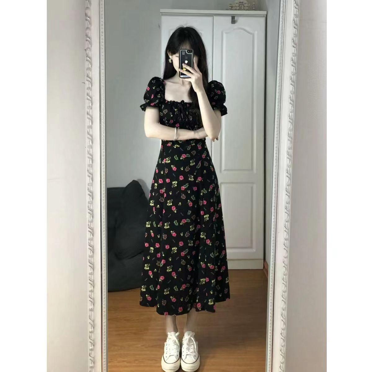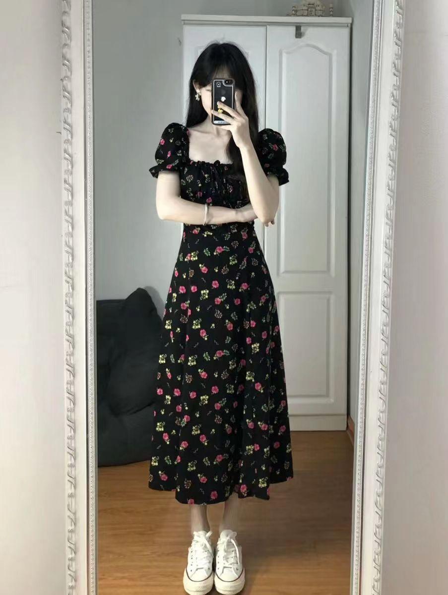 Vestido de manga curta, gola quadrada francesa, cintura fina, elegante, saia em linha A, comprimento médio, saia floral com manga bolha