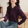 Camisa Roxa de Cetim com Gola Redonda para Mulheres 2024 Novo Estilo Início da Primavera Pequeno Look Emagrecedor Camisa Cobrindo o Corpo Top Fino Solto