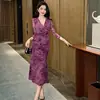 2025 Novo Outono Vestido Feminino Francês Decote V Flocado Estampado Malha Justo Cauda de Peixe Saia Longa 30570