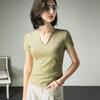 Camiseta feminina chique com decote em V e manga curta, nova cor sólida para o verão