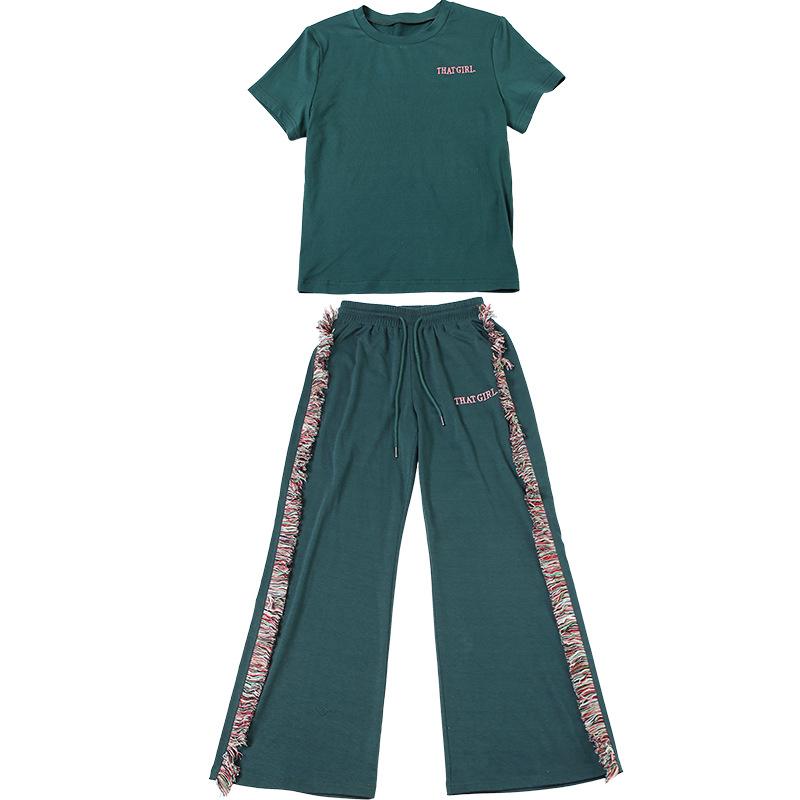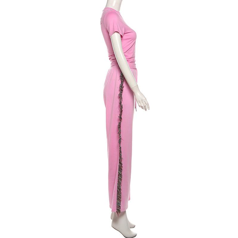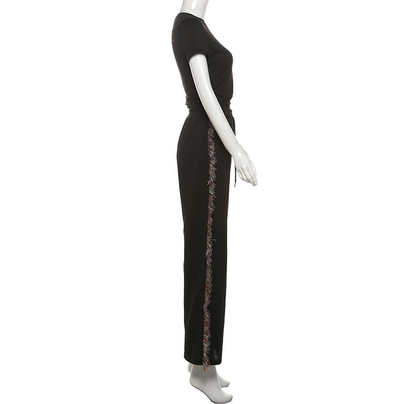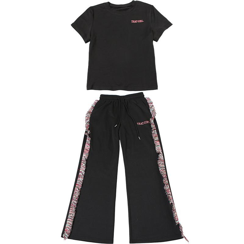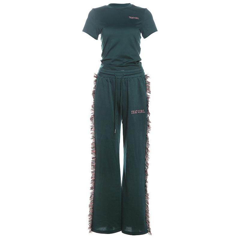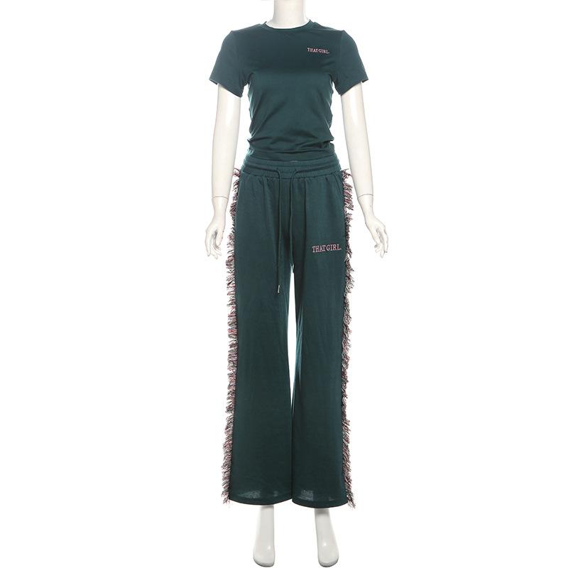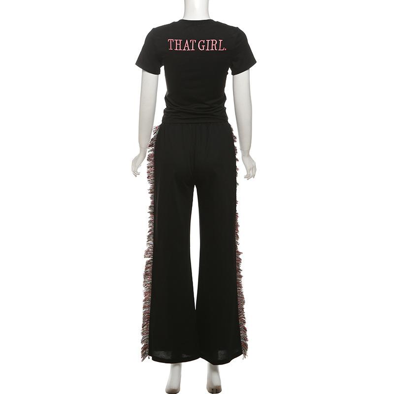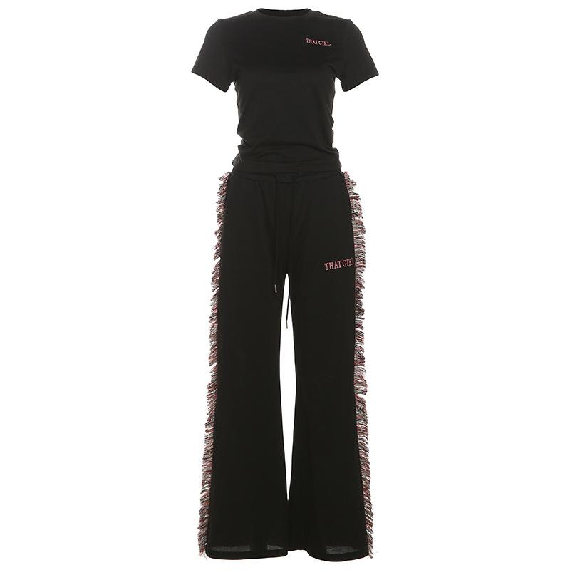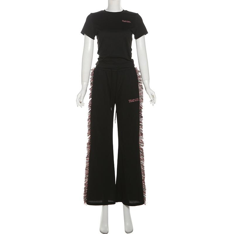 Europeu e Americano 2025 Novo Outono e Inverno Feminino Gola Redonda Bordado Manga Curta Camiseta Franja Lateral Calças de Perna Larga Conjunto de Calças