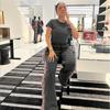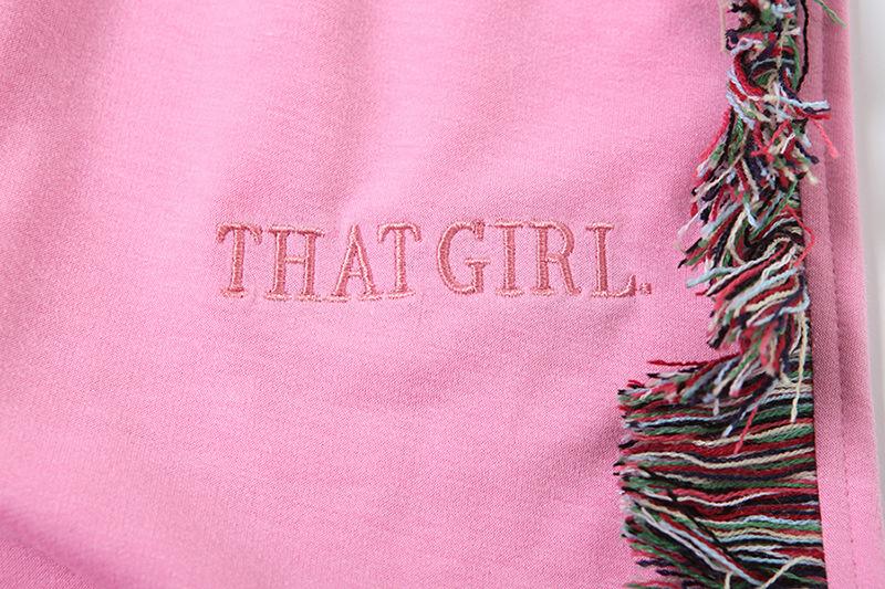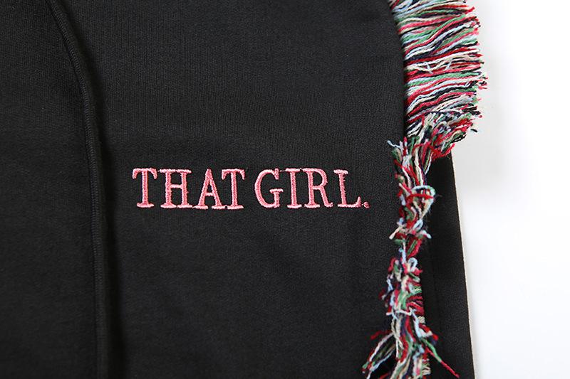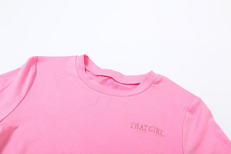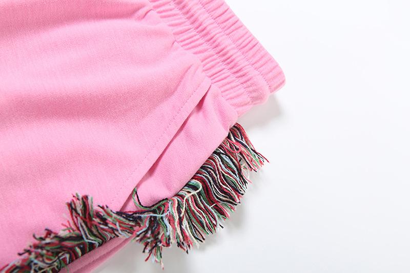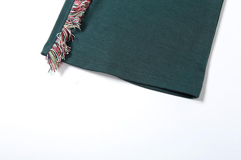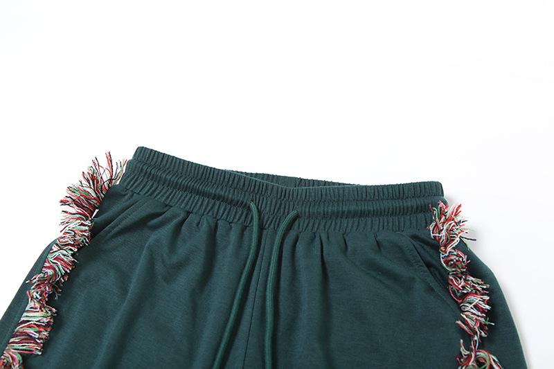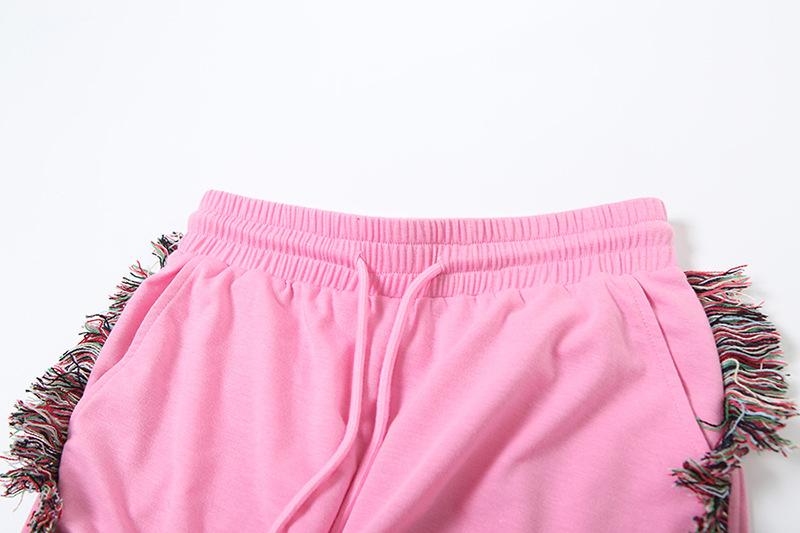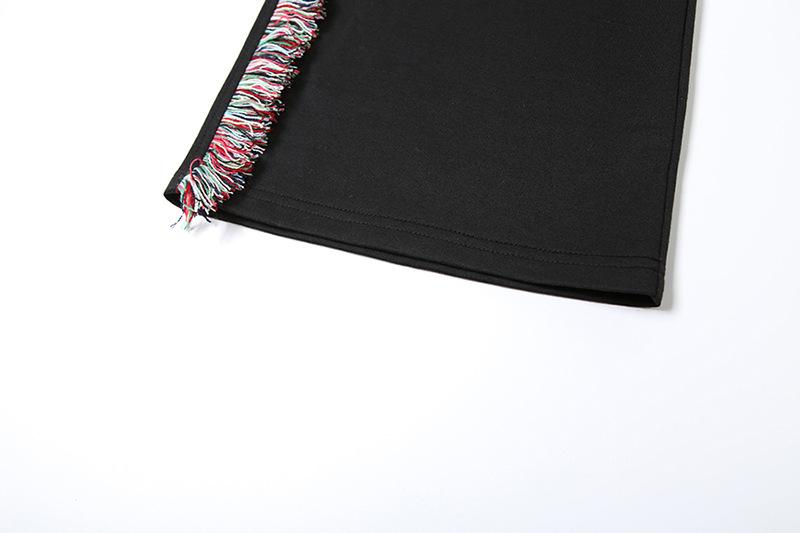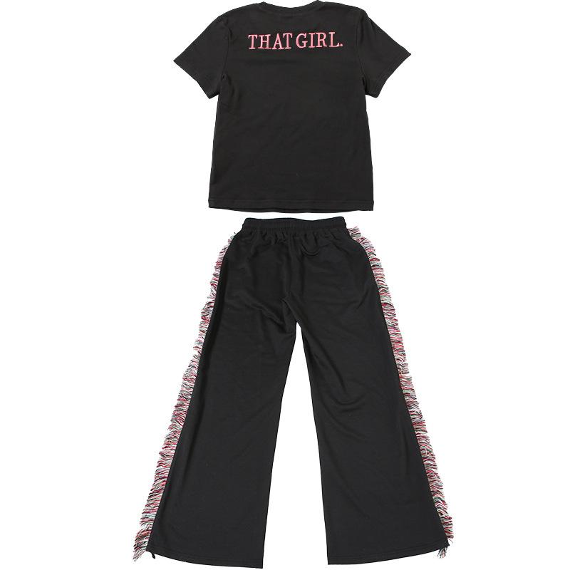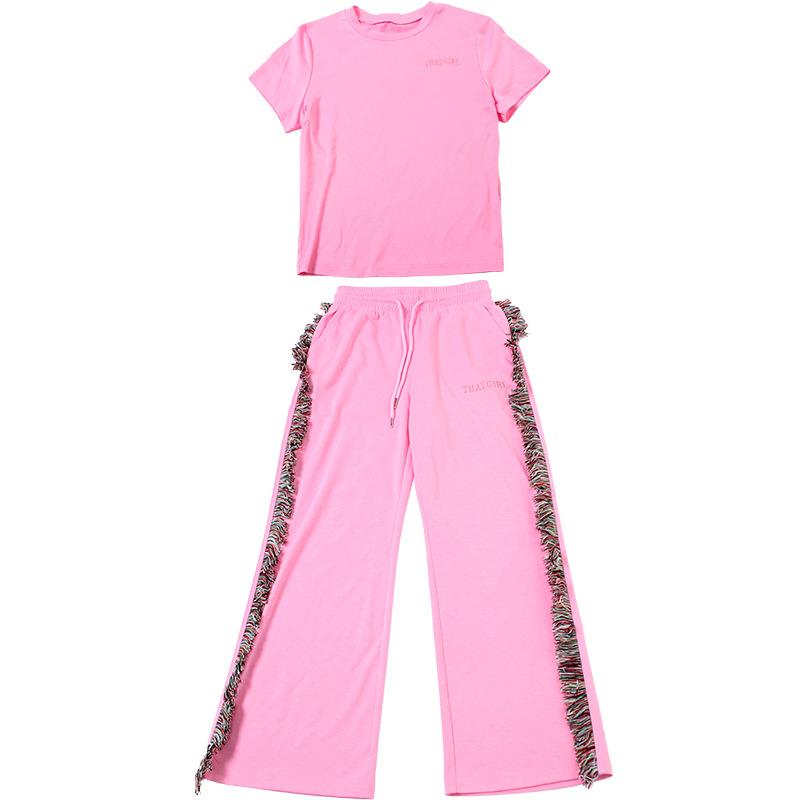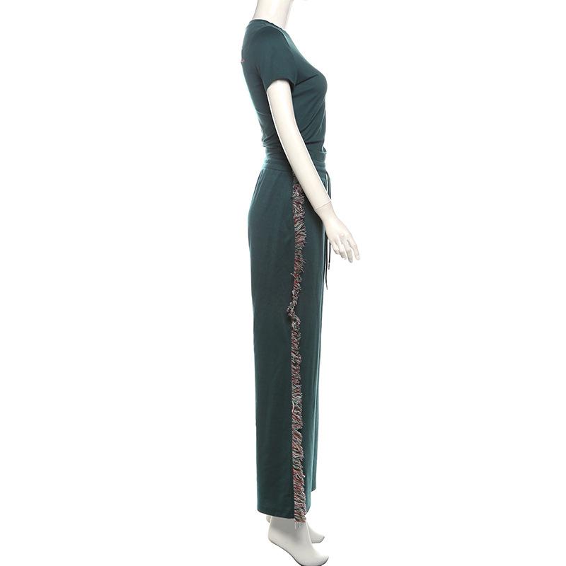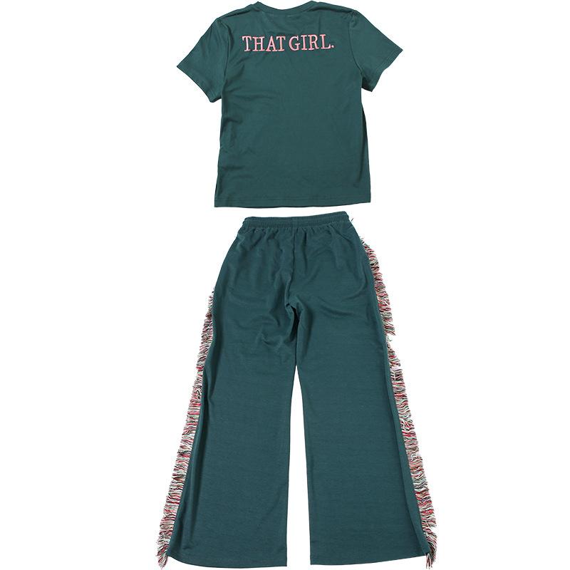 Europeu e Americano 2025 Novo Outono e Inverno Feminino Gola Redonda Bordado Manga Curta Camiseta Franja Lateral Calças de Perna Larga Conjunto de Calças