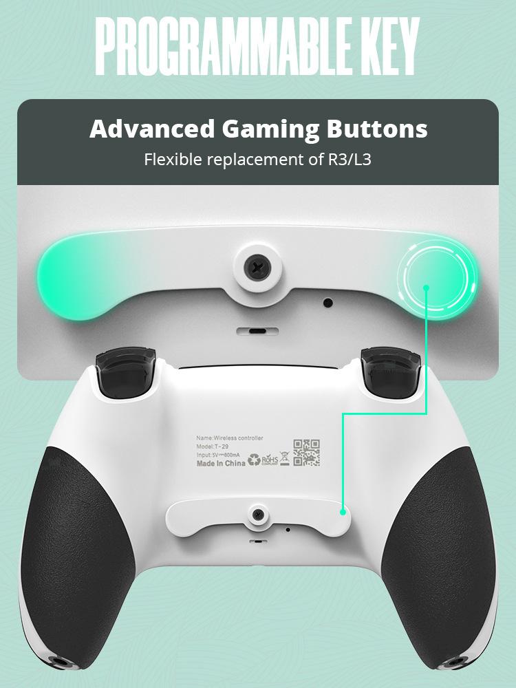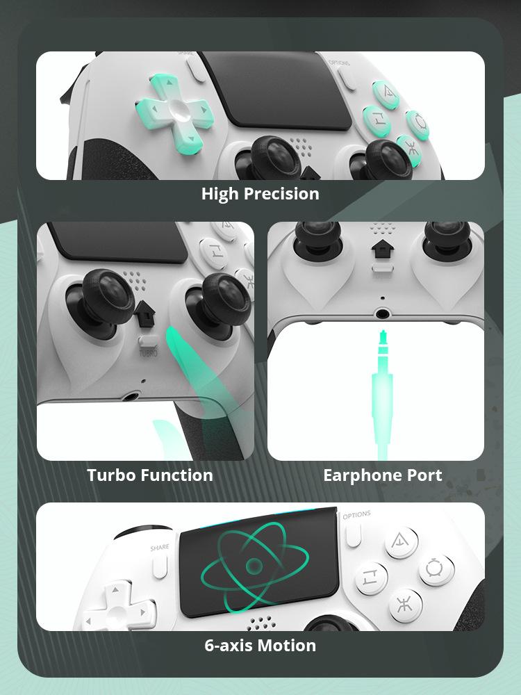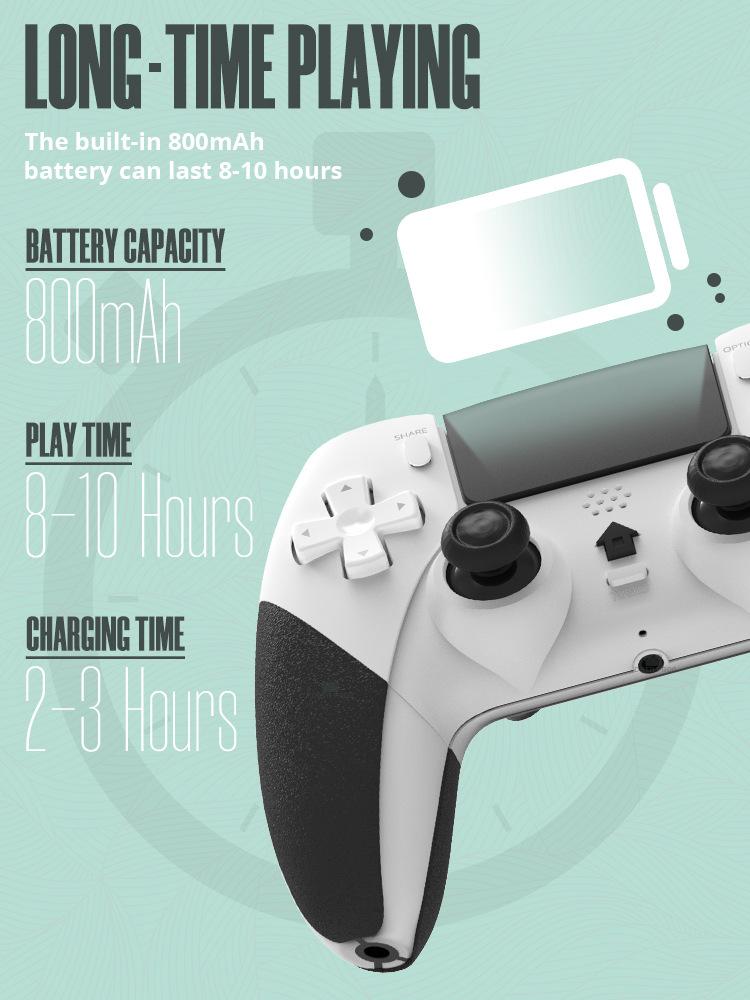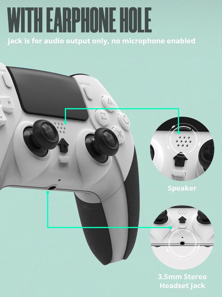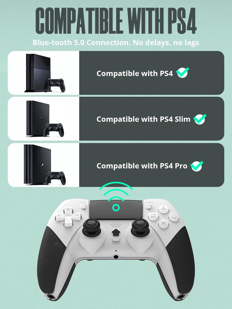 Este produto é um controle de PS4, com programação macro, com seis eixos, com vibração, com função turbo, bateria 800 embutida, é um controle Bluetooth sem fio (usando tecnologia Bluetooth sem fio), função turbo e mapeamento de botões embutidos, pode ser controlado remotamente, fácil de operar, pode ser usado para consoles PS4/PS4slim/PS4Pro, suporta jogar jogos de PS4 em consoles PS5 (não suporta jogos de PS5)