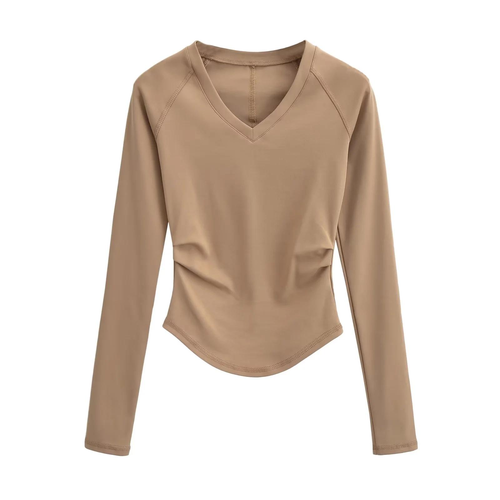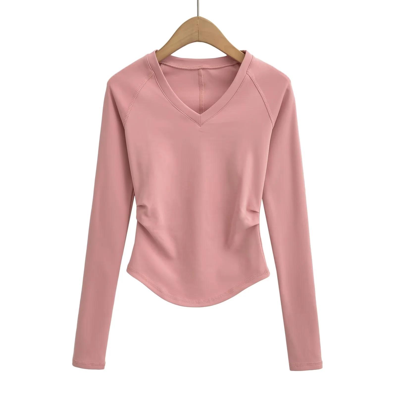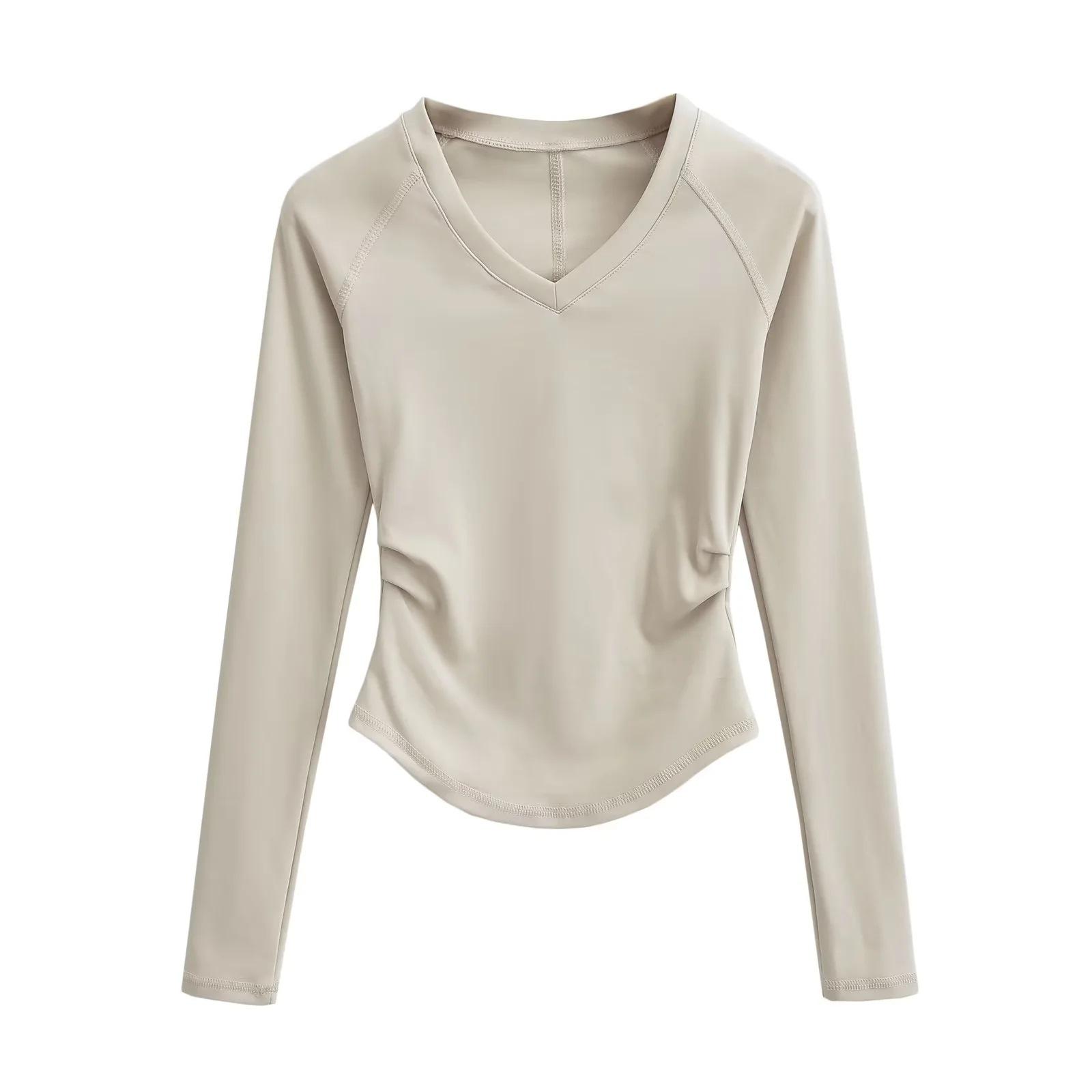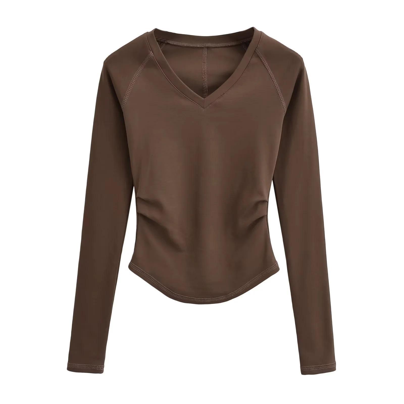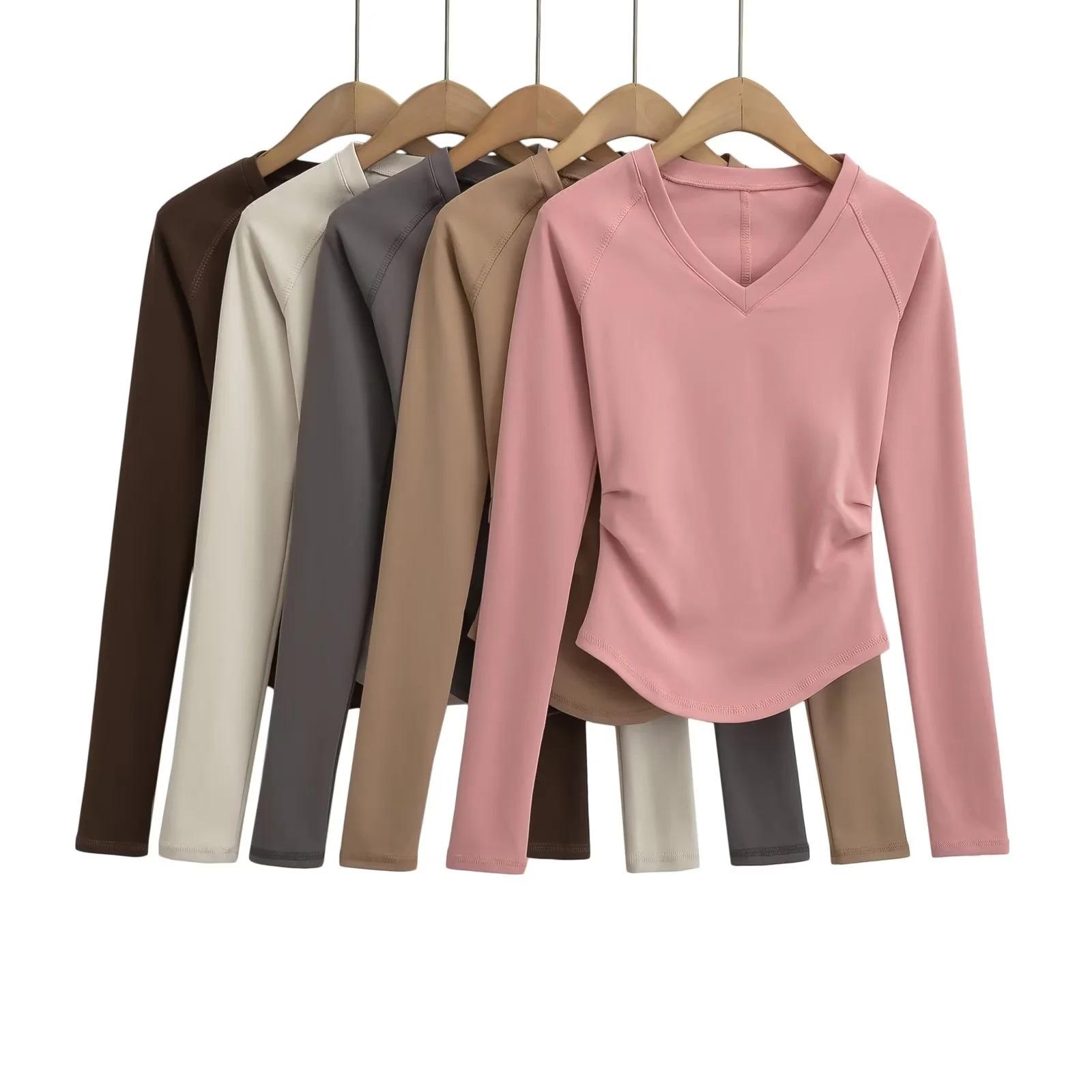 Compre Novo Outono e Inverno 2023 Design Três Agulhas Cinco Linhas Decote em V Plissado Slim-Fit Manga Longa Blusa Cor Sólida Camiseta Básica no atacado no Joom.pro