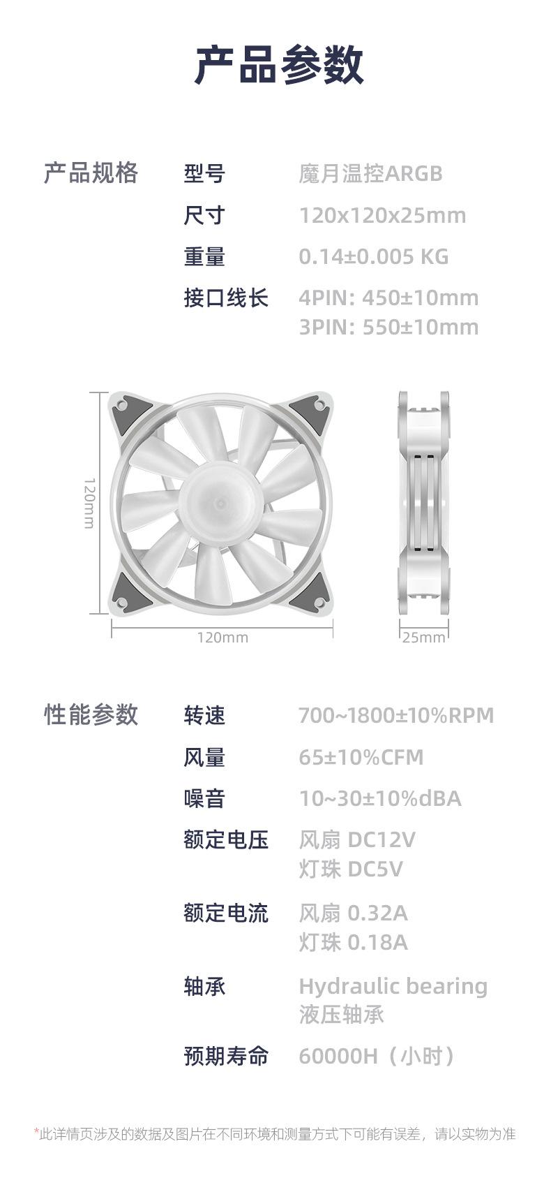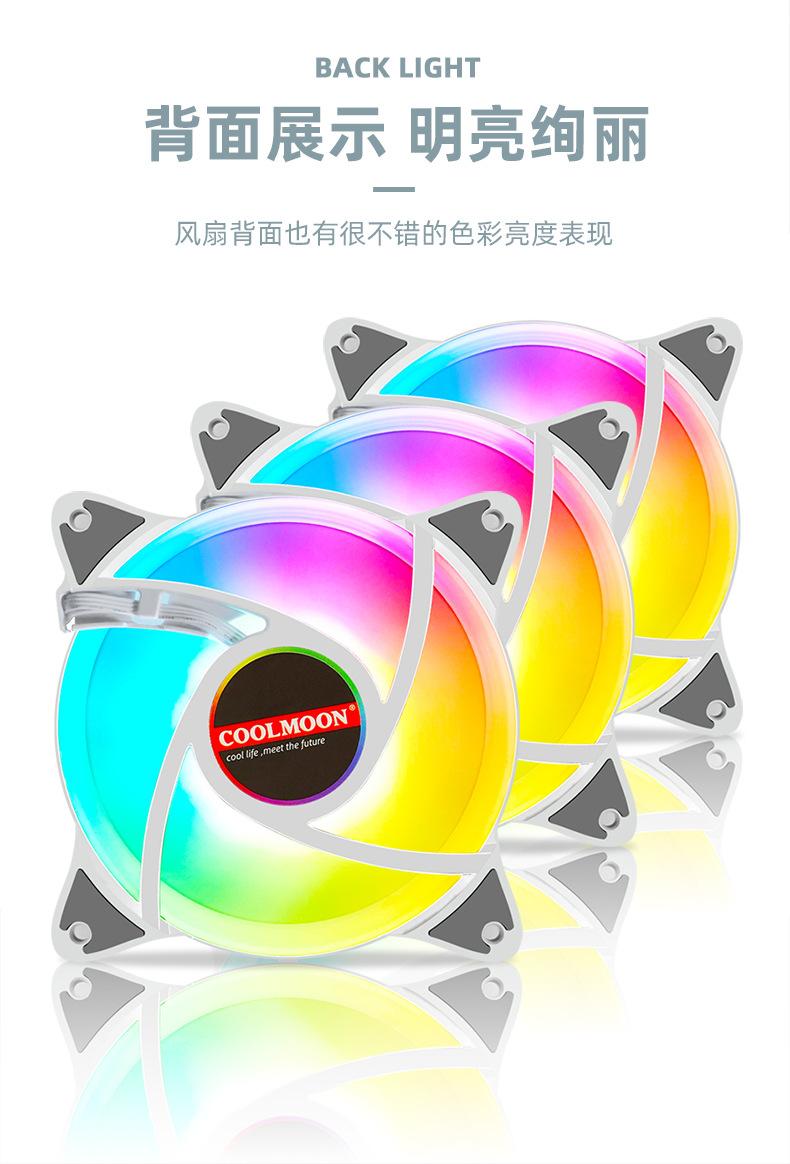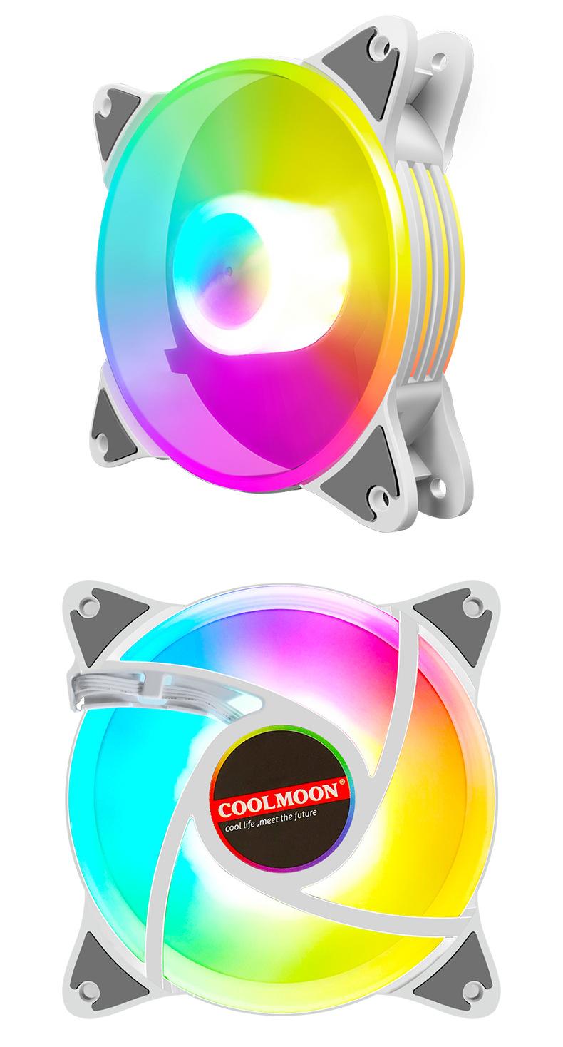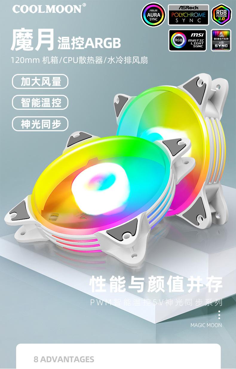 Ventoinha Magic Moon 5V ARGB com controle de temperatura e regulagem de velocidade, usa motor com rolamento de alta qualidade, esferas de lâmpada RGB de alto brilho, alta velocidade 800-1800RPM ajustável, pás grandes e grande volume de ar, adequada para coolers de ar para CPU, coolers de água para CPU, gabinetes de computador, com controlador Cool Moon para controle de temperatura, pode ajustar velocidade, brilho e modo, muito conveniente! A versão branca desta ventoinha tem os pés de borracha alterados para pés de borracha brancos [Suporta vendas internacionais, proteção global de marca registrada para distribuidores, pode fornecer embalagem com imagem em inglês]