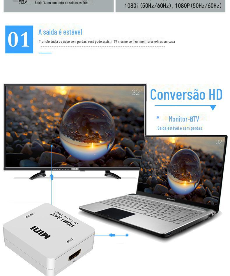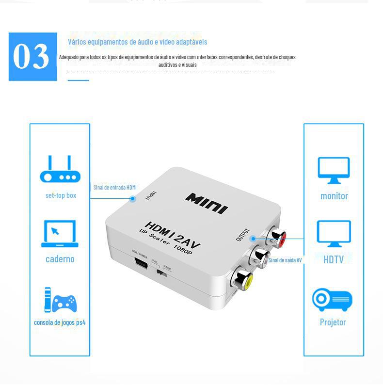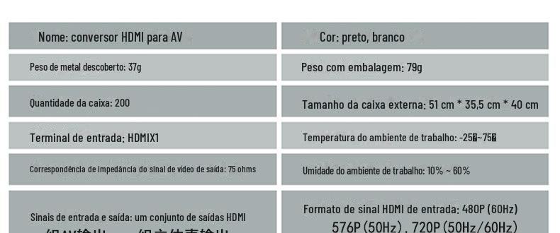 1. Converta o sinal HDMI de alta definição em saída de sinal de vídeo 576I, 480I (PAL/NTSC) por meio do processamento de vídeo SCALE DOWN;