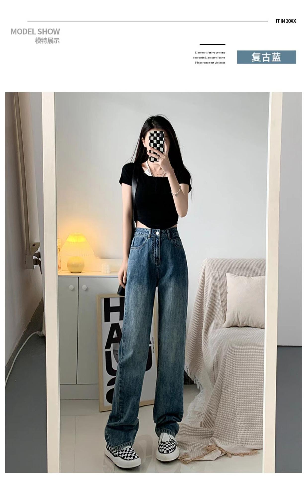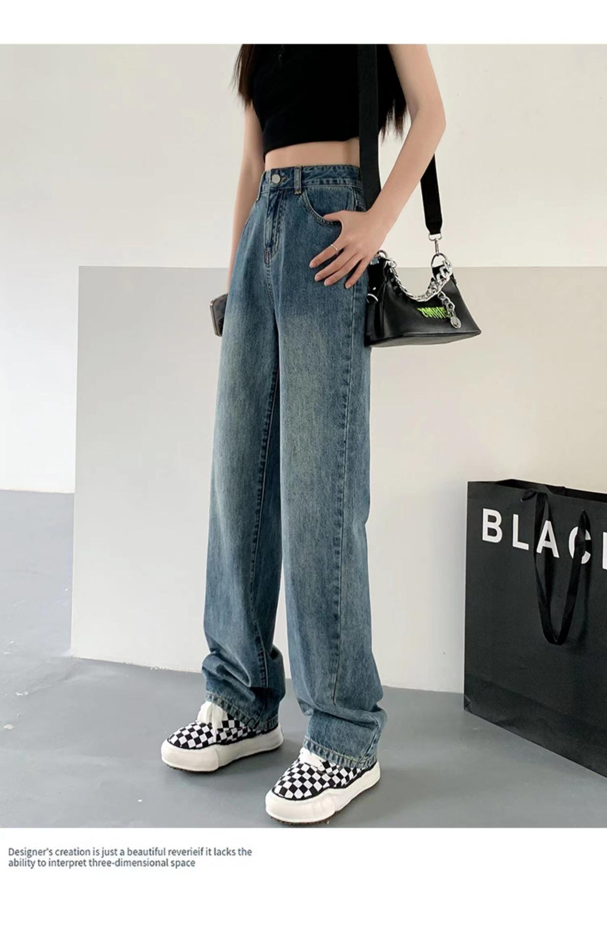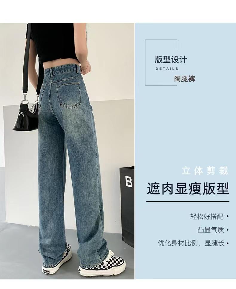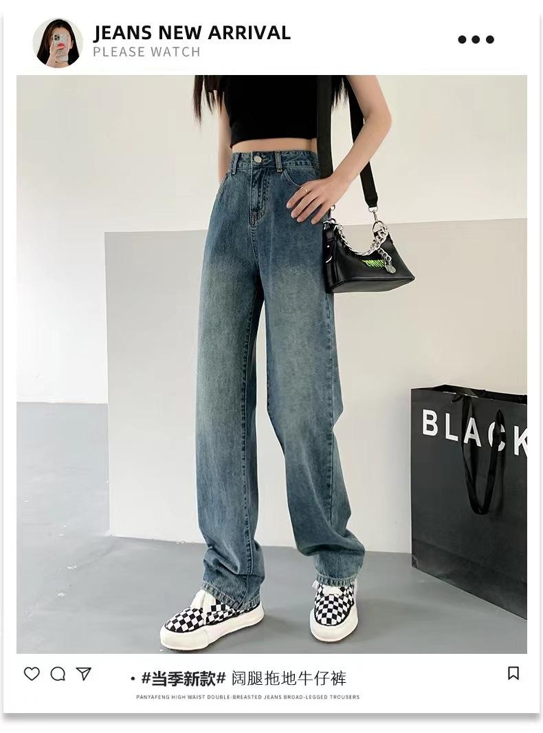 Compre Cintura alta jeans retrô solto perna larga jeans cintura alta feminina 2024 Primavera Nova calça de esfregão reto no atacado no Joom.pro