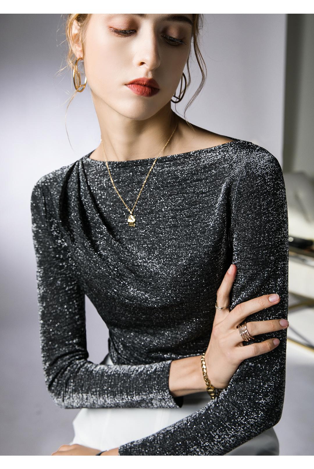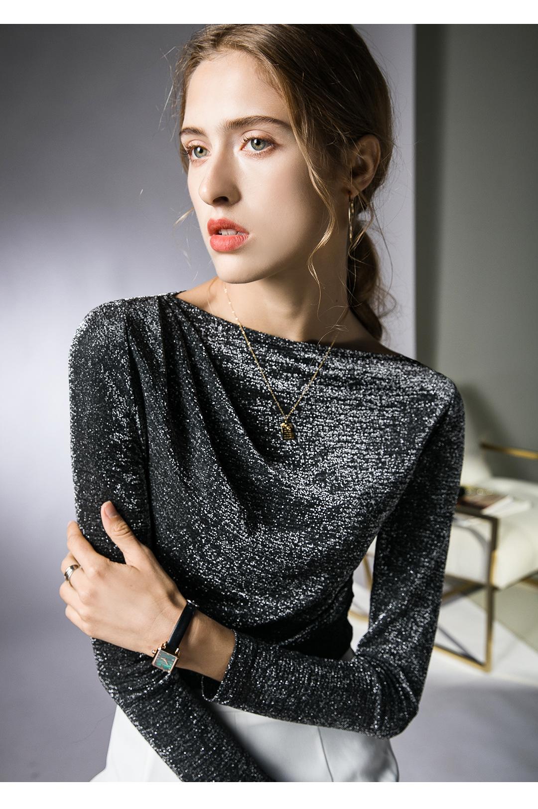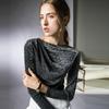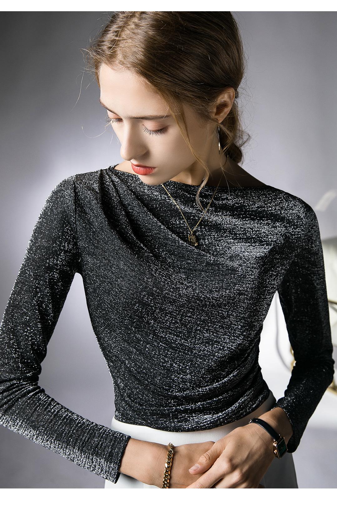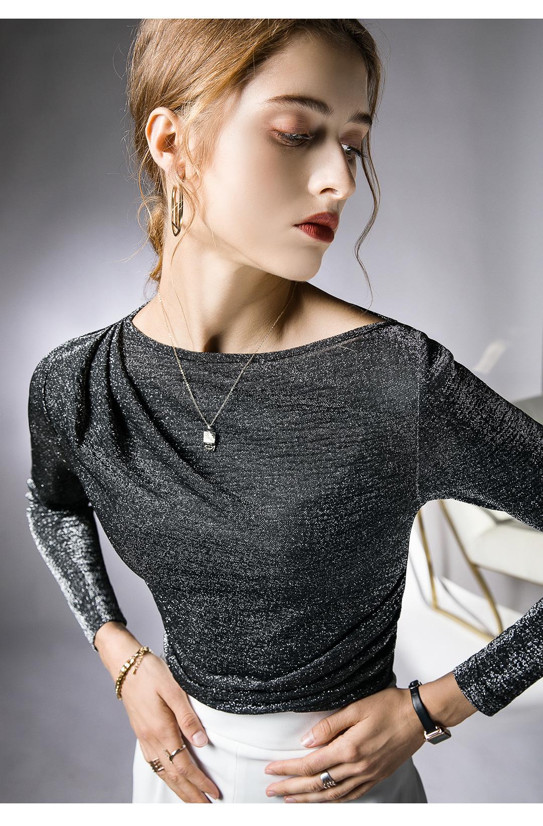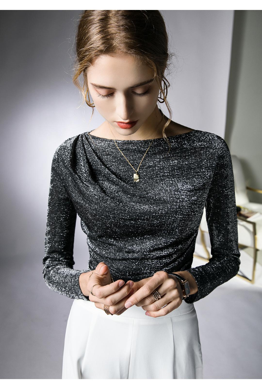 T-shirt de seda brilhante de alta qualidade off-neck top outono novo design plissado camisa pequena temperamento emagrecimento camisa inferior