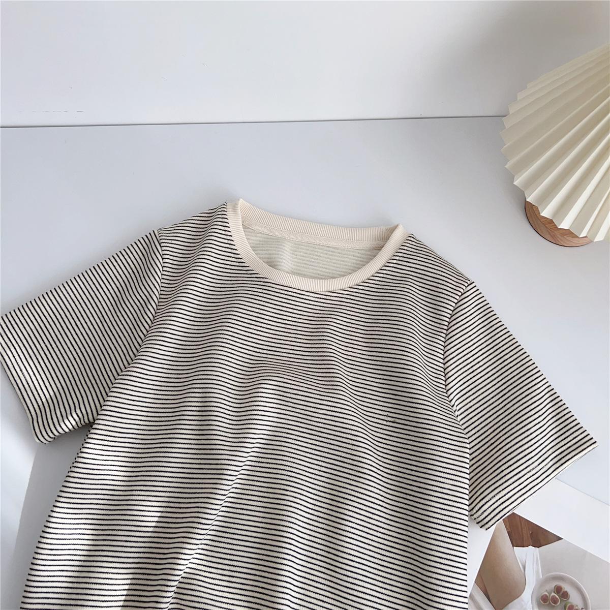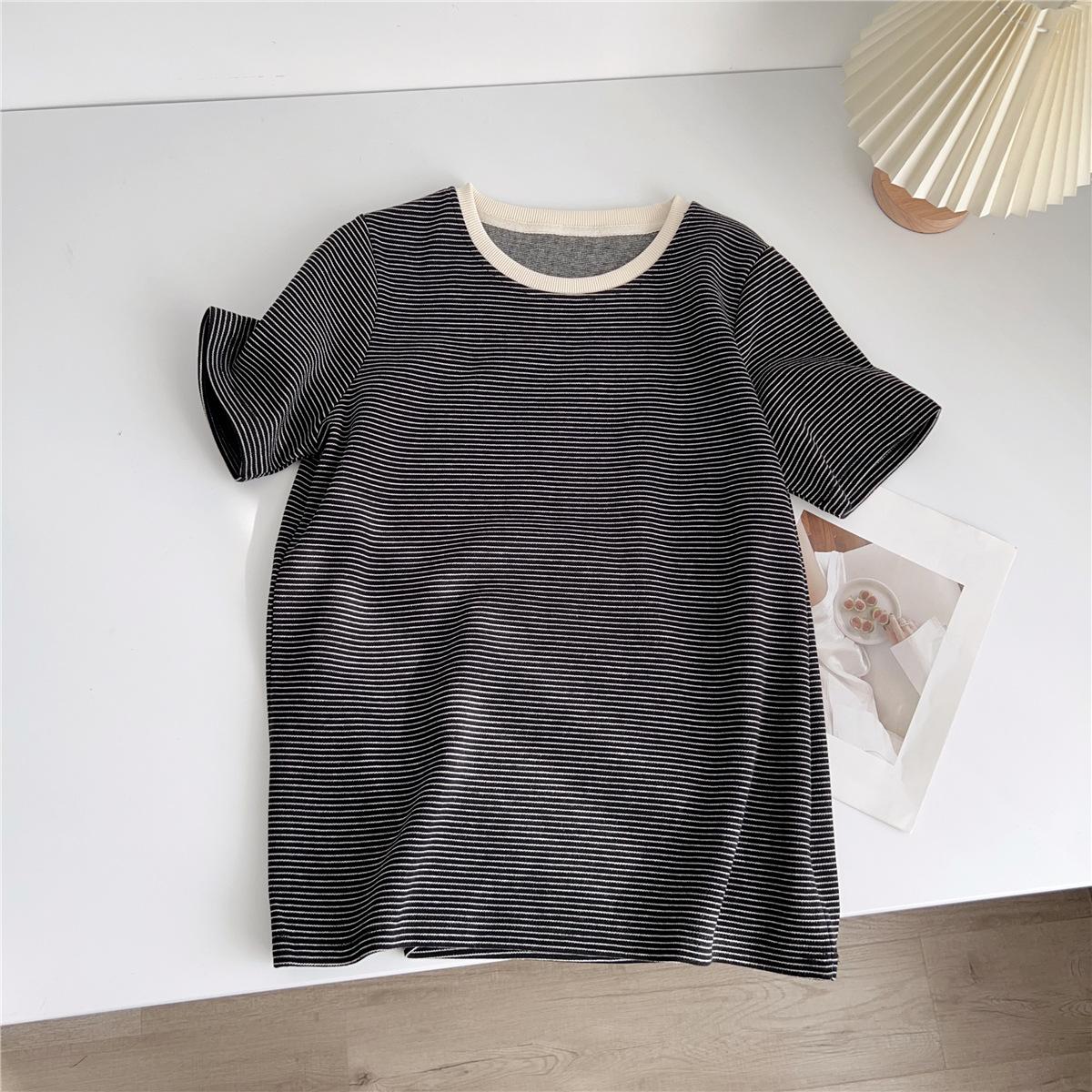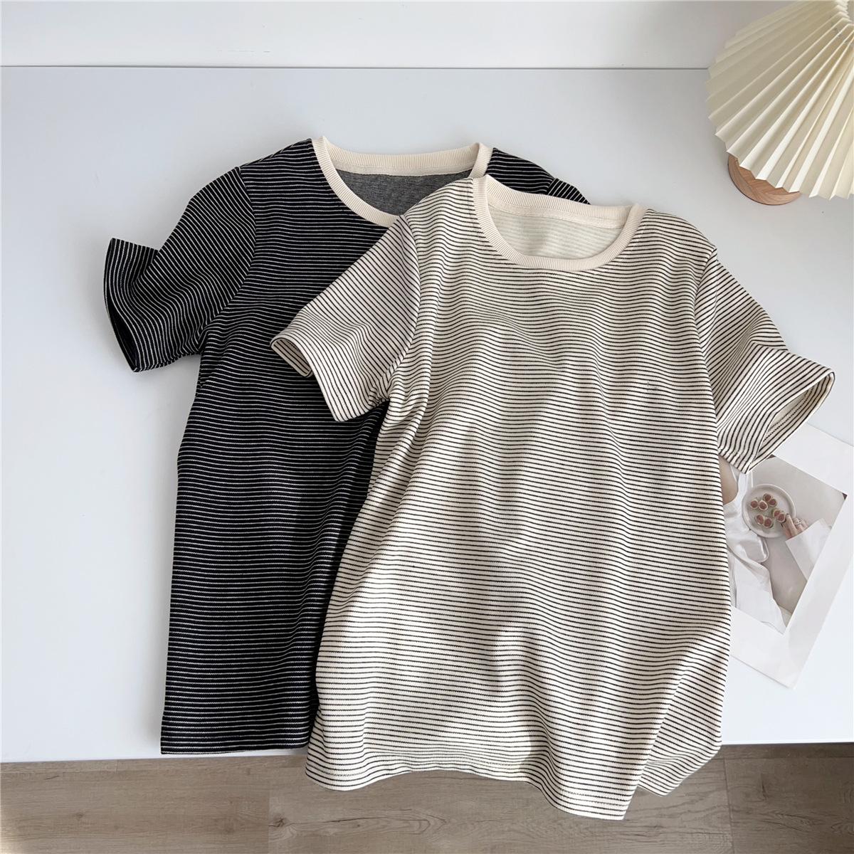 2024 Primavera Nova Camiseta Feminina Simples de Gola Redonda Listrada Ombro Regular Solta Emagrecimento Versátil Manga Curta Tendência Feminina
