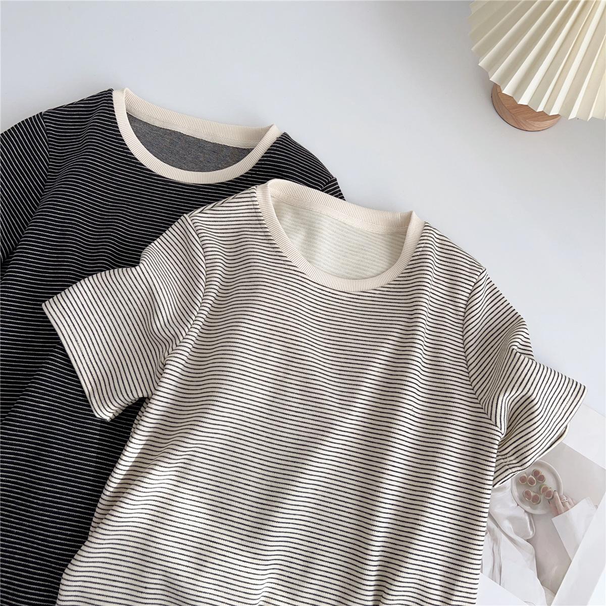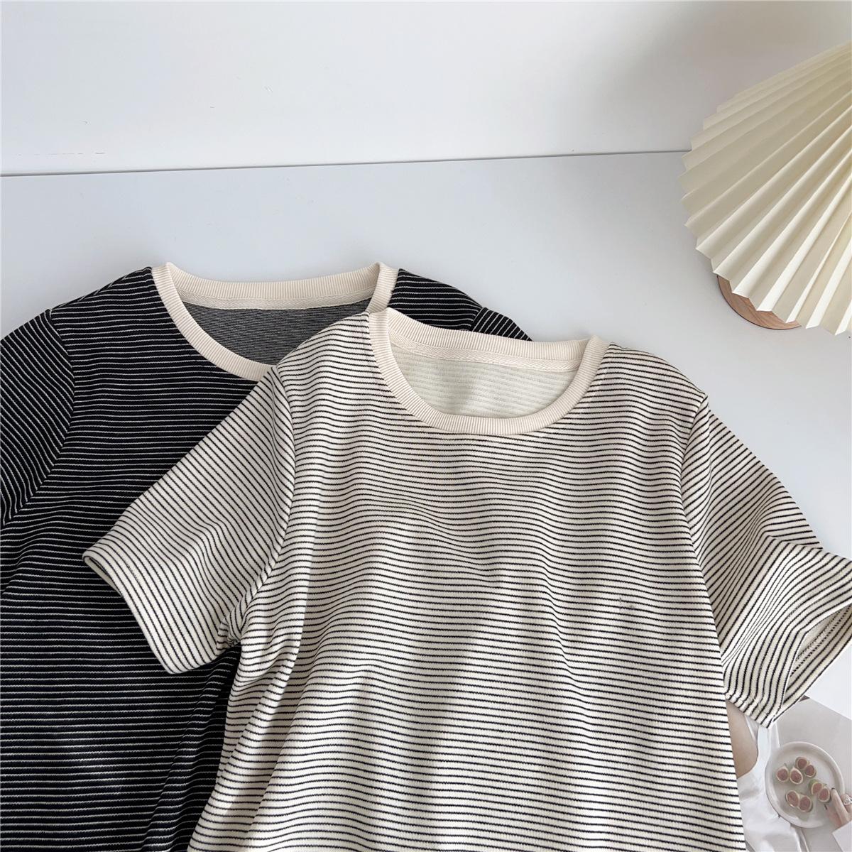 Compre 2024 Primavera Nova Camiseta Feminina Simples de Gola Redonda Listrada Ombro Regular Solta Emagrecimento Versátil Manga Curta Tendência Feminina no atacado no Joom.pro